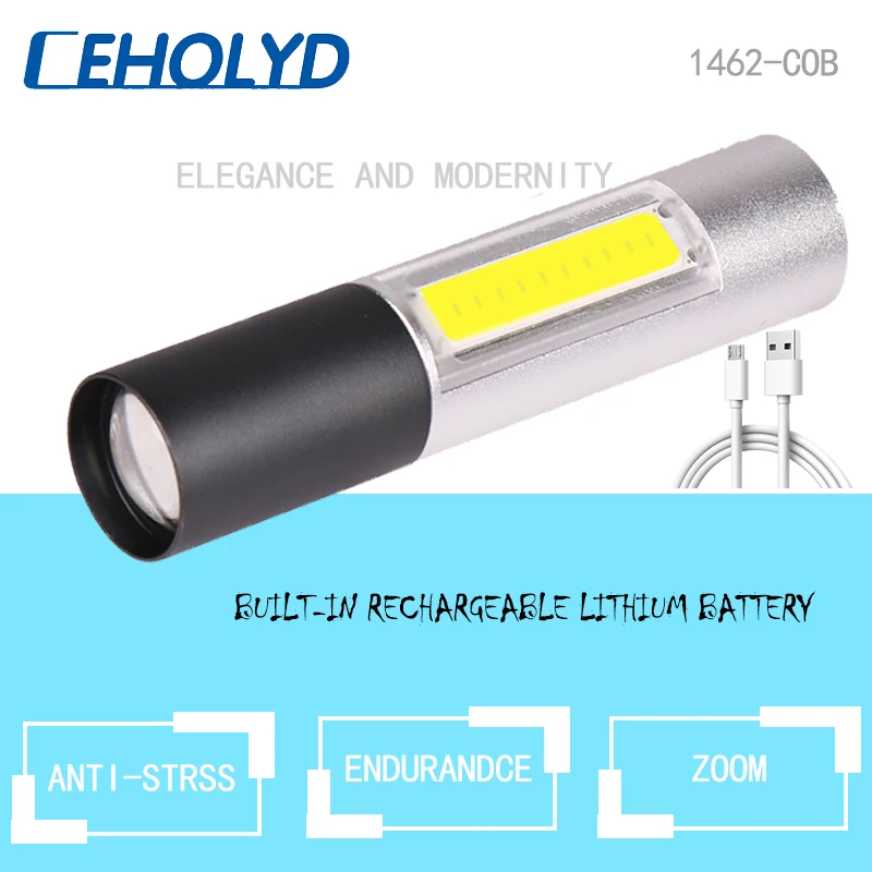 Светодиодный мини-фонарик с зарядкой от USB, водонепроницаемый стильный портативный фонарь с телескопическим зумом и 3 режимами освещения, Q5 + COB