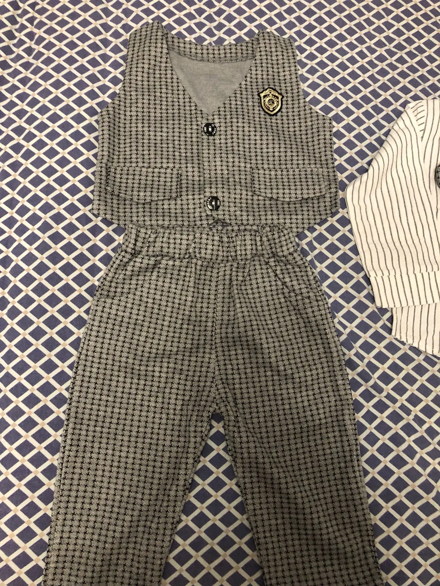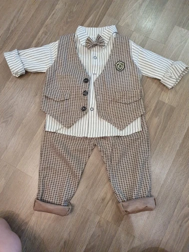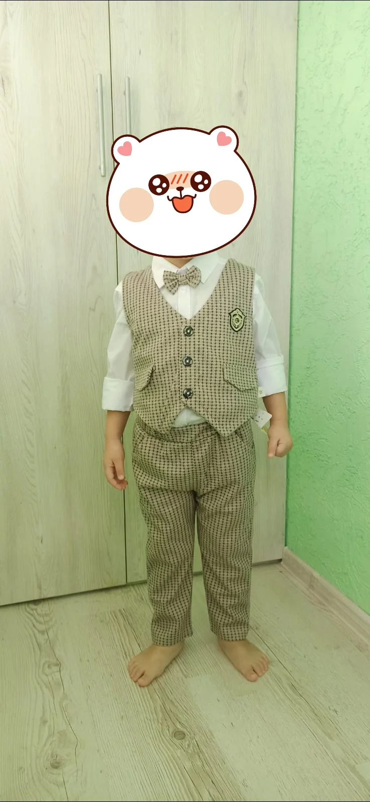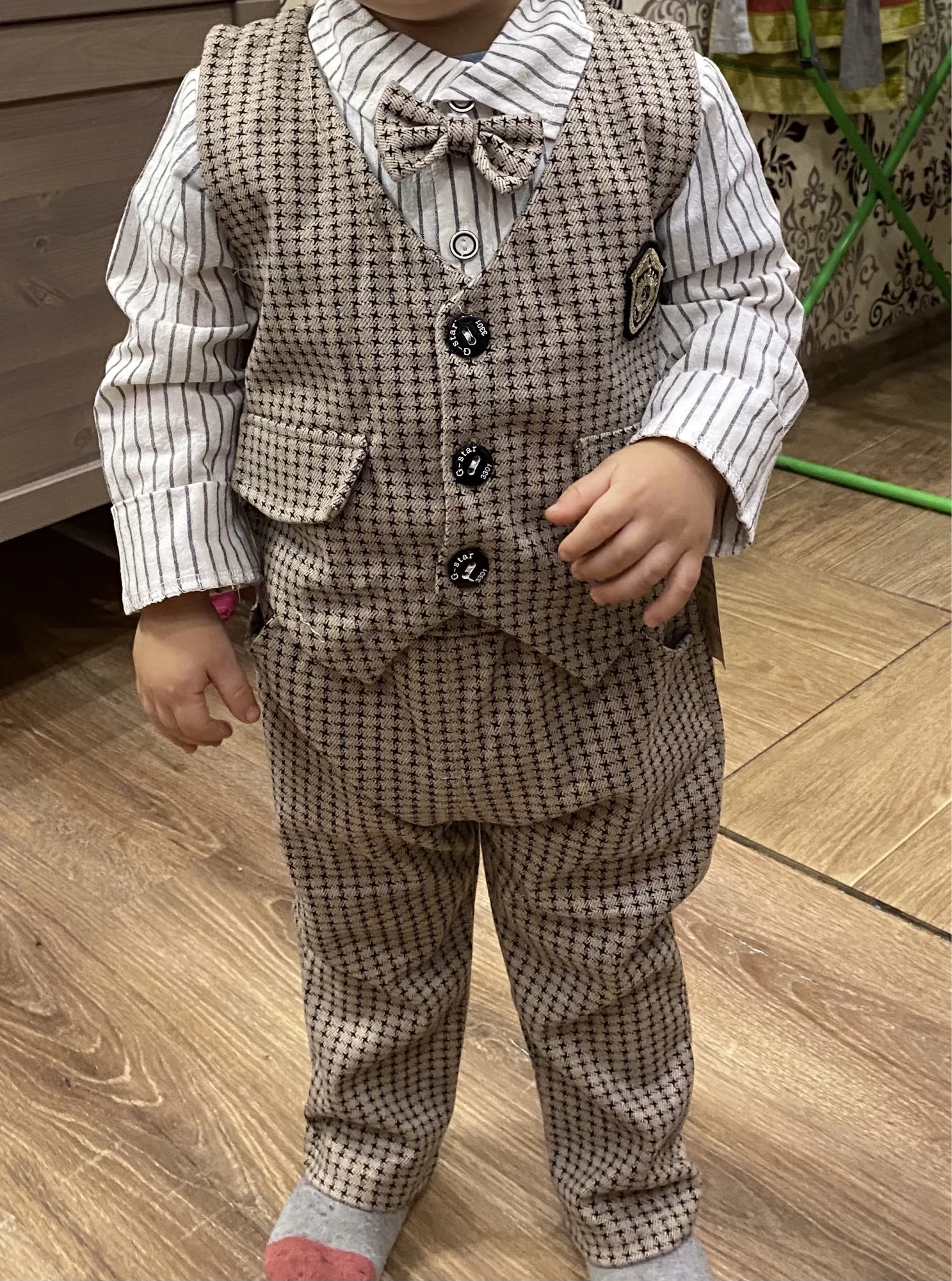 Костюмчик очень милый! Размер подошел, рукава у рубашки длинные немного, я подшила. Очень много торчало ниток, но это не критично, все можно аккуратно подрезать. Материал у штанов и жилетки приятный и плотный.