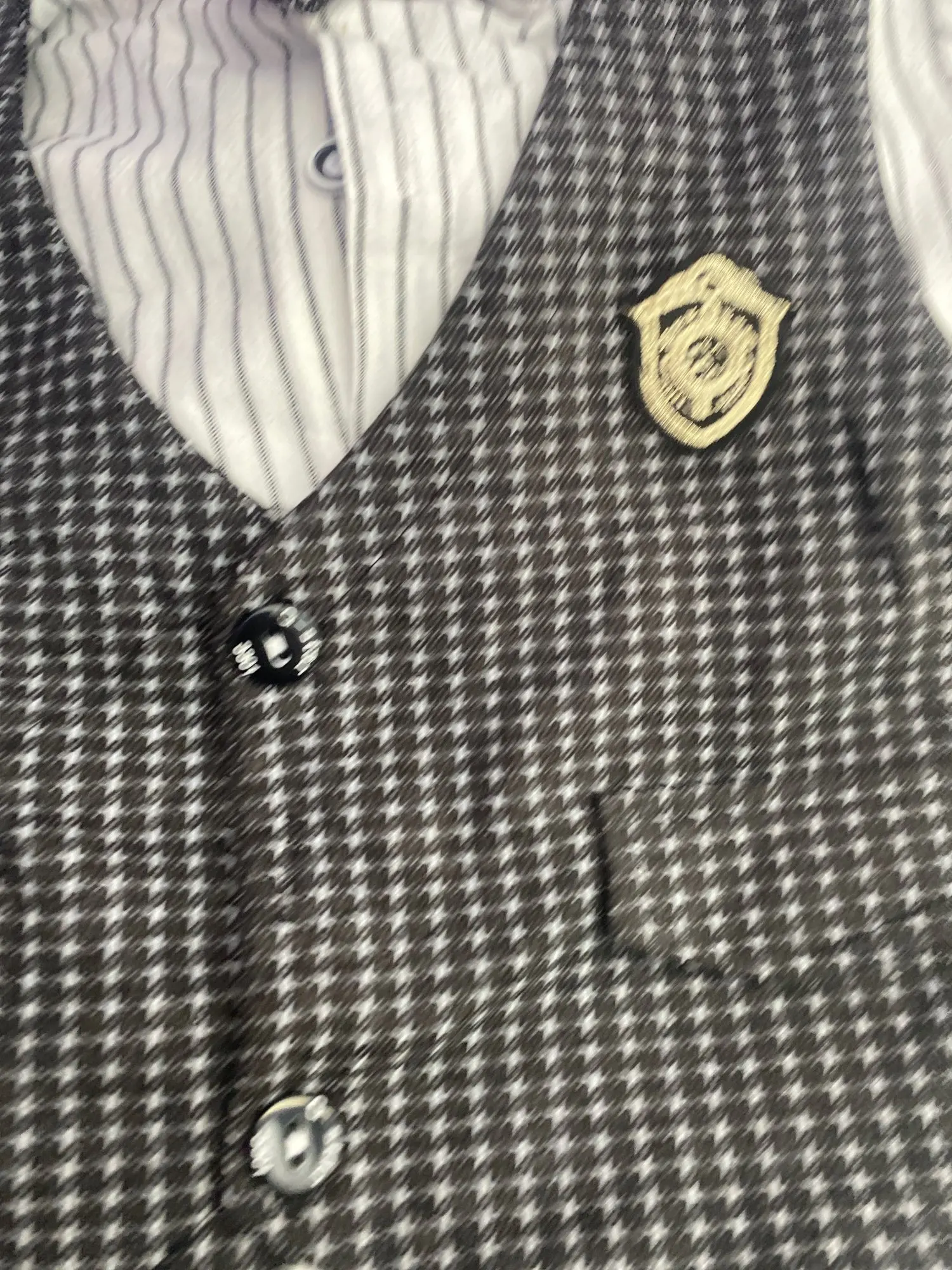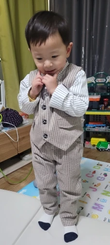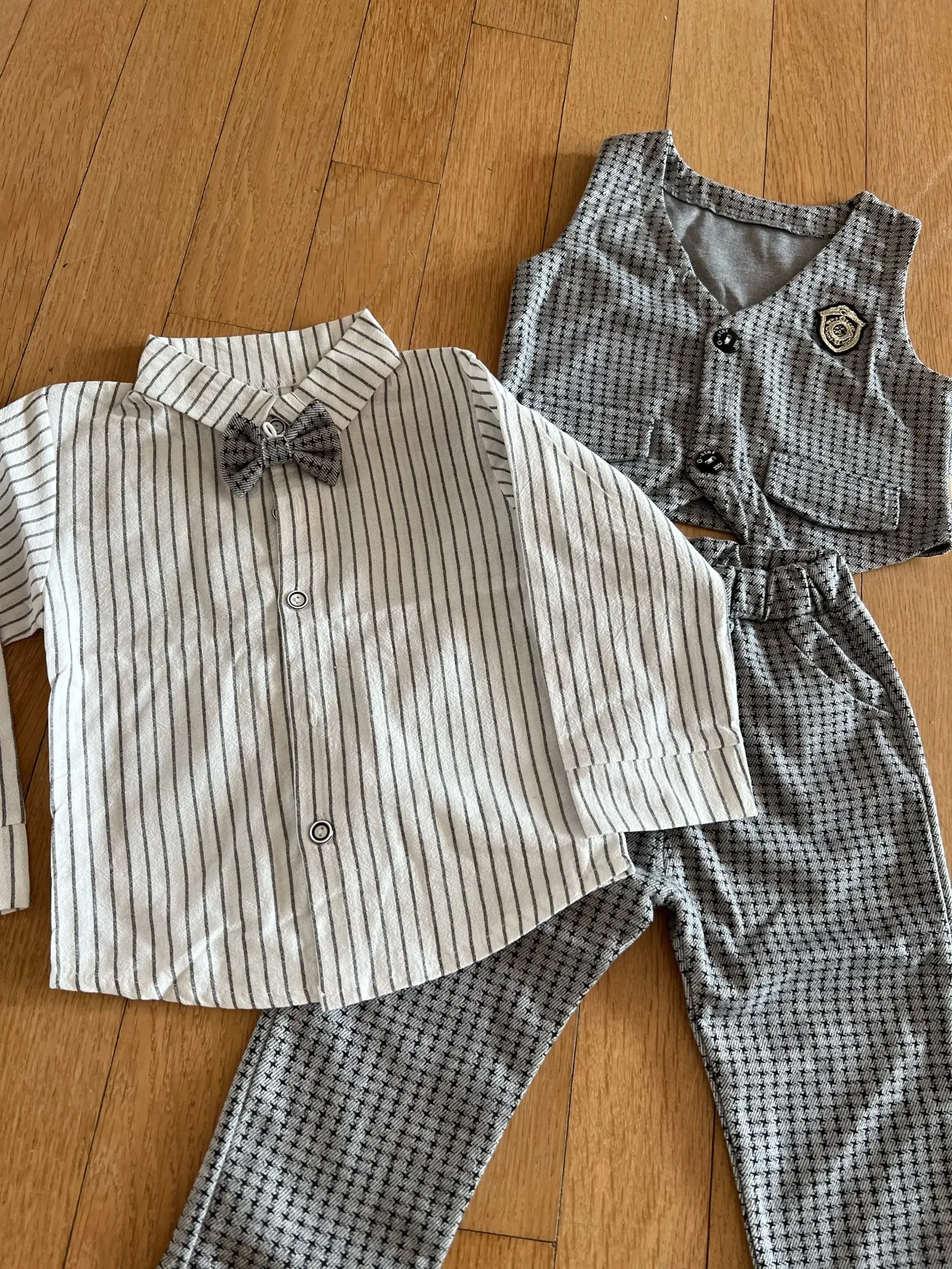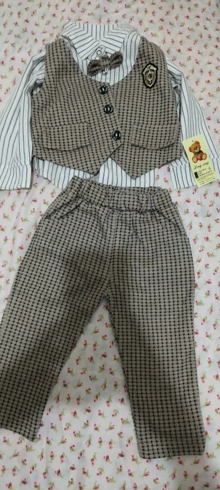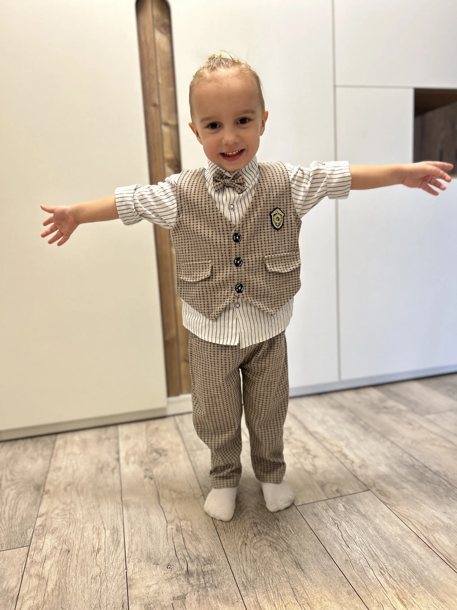 Костюмчик очень милый! Размер подошел, рукава у рубашки длинные немного, я подшила. Очень много торчало ниток, но это не критично, все можно аккуратно подрезать. Материал у штанов и жилетки приятный и плотный.