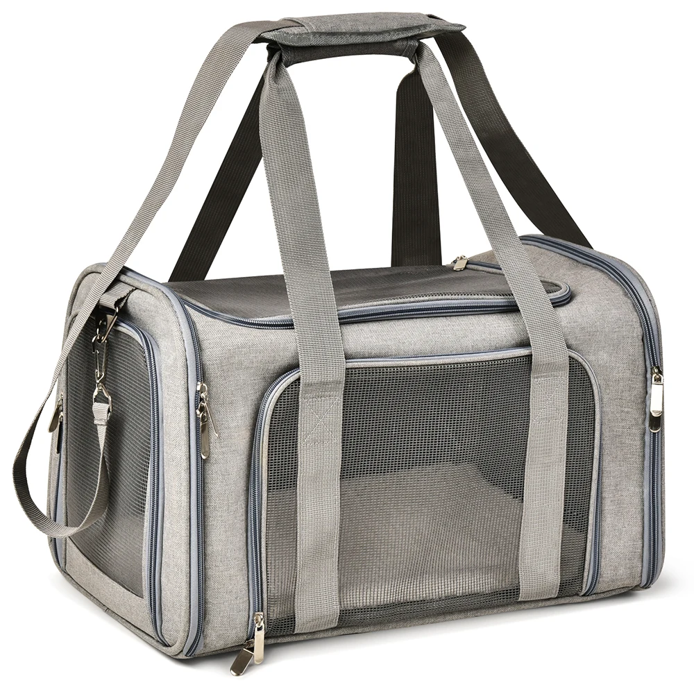 Этот переносчик для домашних животных обеспечивает две соединительные петли ручки для сбалансированной переноски в качестве двойного ремня безопасности или багажного ремня для безопасной транспортировки.