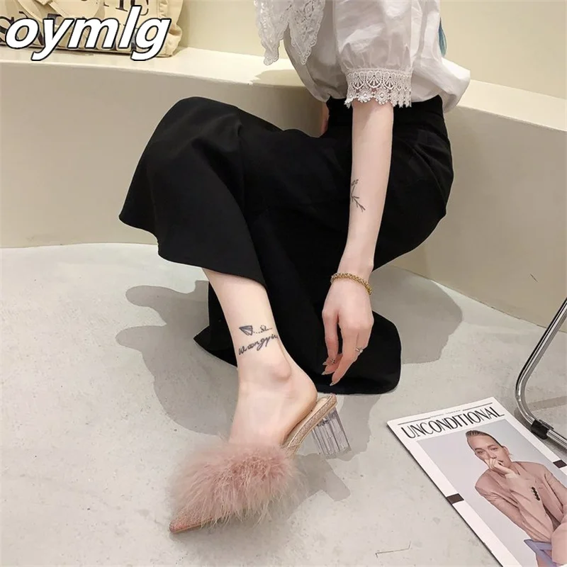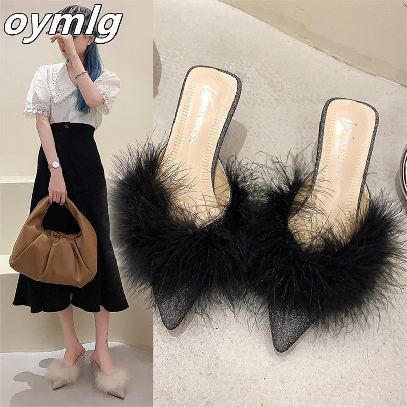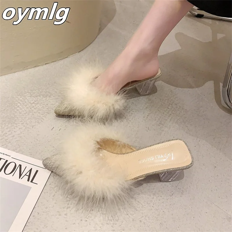 Новинка 2022, стильные пушистые тапочки, летняя одежда, женская модная обувь с острым носком на толстом высоком каблуке Baotou