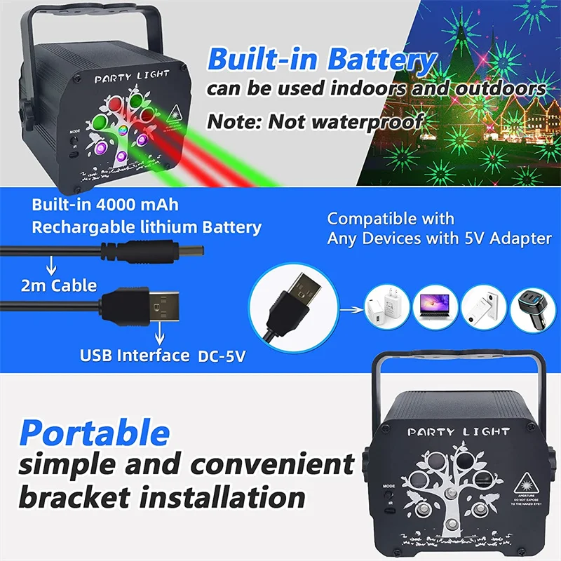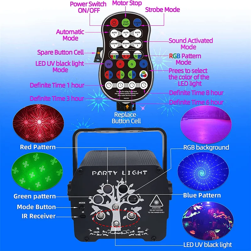3 в 1 лазерный и светодиодный, с узором, вечерние, дискотечный светильник, оснащенный 120 рисунками, 8 цветов фона (красный, зеленый, синий, красный, зеленый, красный, синий, синий, зеленый, красный, зеленый и синий), 3 комбинации пучков (красный, зеленый, синий) Для создания потрясающих и мощных сценических световых эффектов, высококачественных изображений и RGB st. Освещение ночного платья, романтичное, мечтательное и потрясающее.