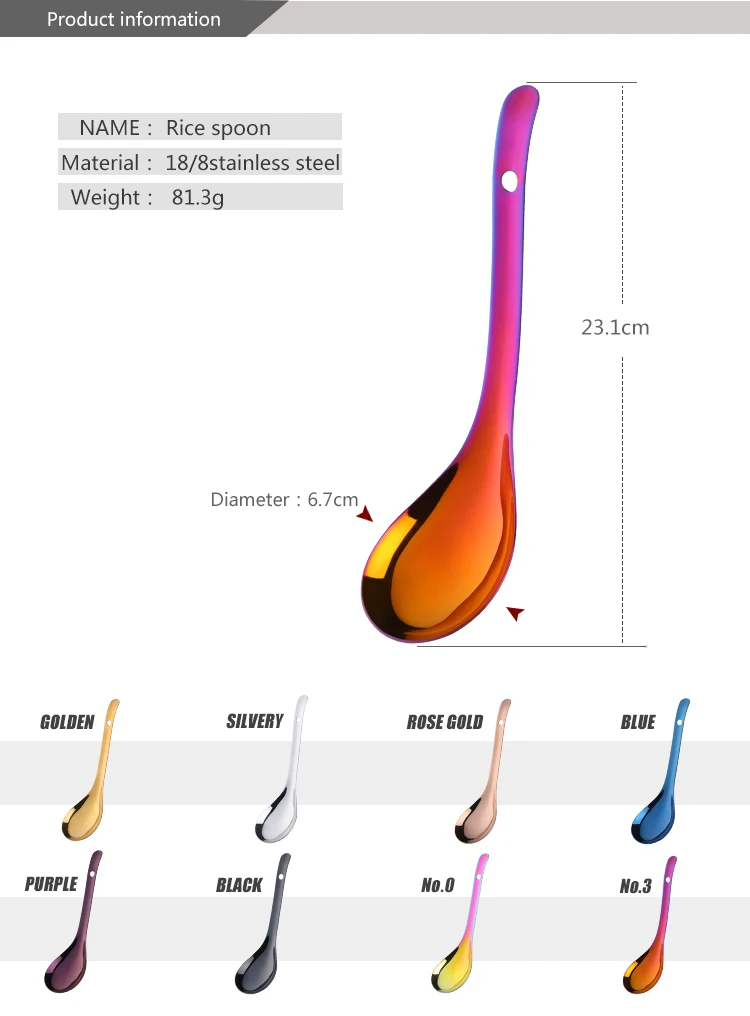 Подробности: Название бренда: Buy GoСтиль: традиционный китайский стильЦвет: серебристый, золотой, розовое золото, черный, фиолетовый, синий, РадужныйМатериал: нержавеющая сталь 304Размеры: 23x6,7 смВес: 81,3 г Посылка включает:1 x рисовая ложка