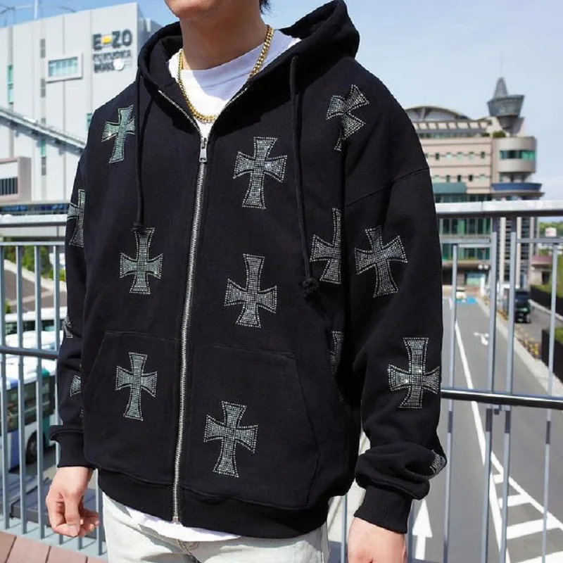 Y2K Стразы худи Скелет Мужская Осенняя уличная одежда на молнии гот...