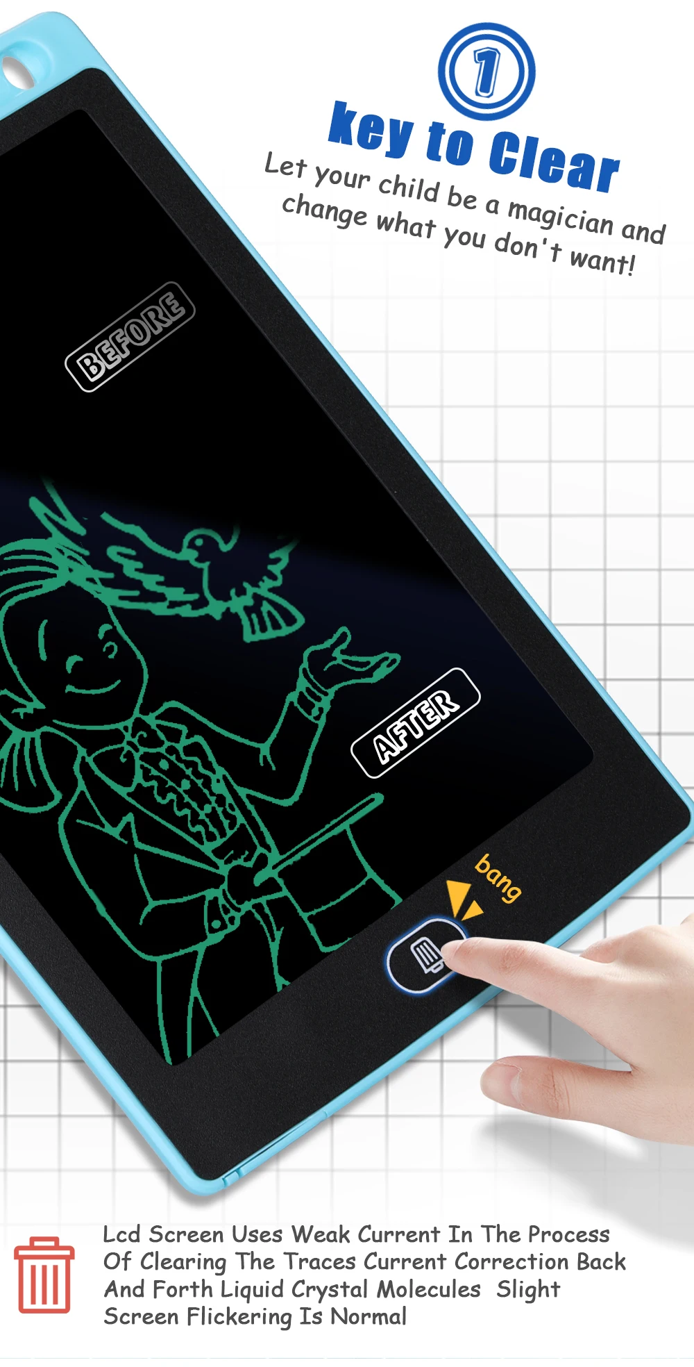 Название продукта: ЖК-планшет для рисованияМатериал: пластик + ЖК-экранРазмер: 8,5/10/12 дюймаЦвет: черный, розовый, синийРежим:1. Один цвет письма2. Многоцветное письмо