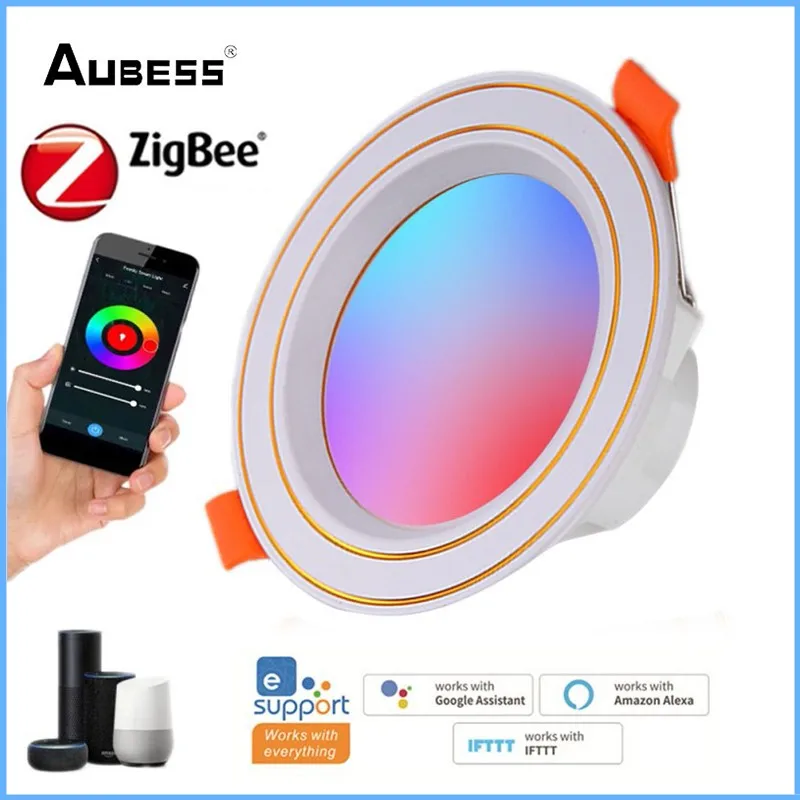 Светодиодный умный светильник Aubess Zigbee, круглая лампа с регулировкой света Tuya, точечный светильник RGBWC, диммер для потолка, комнатный светильник с теплым холодным светом RGB, 10 Вт