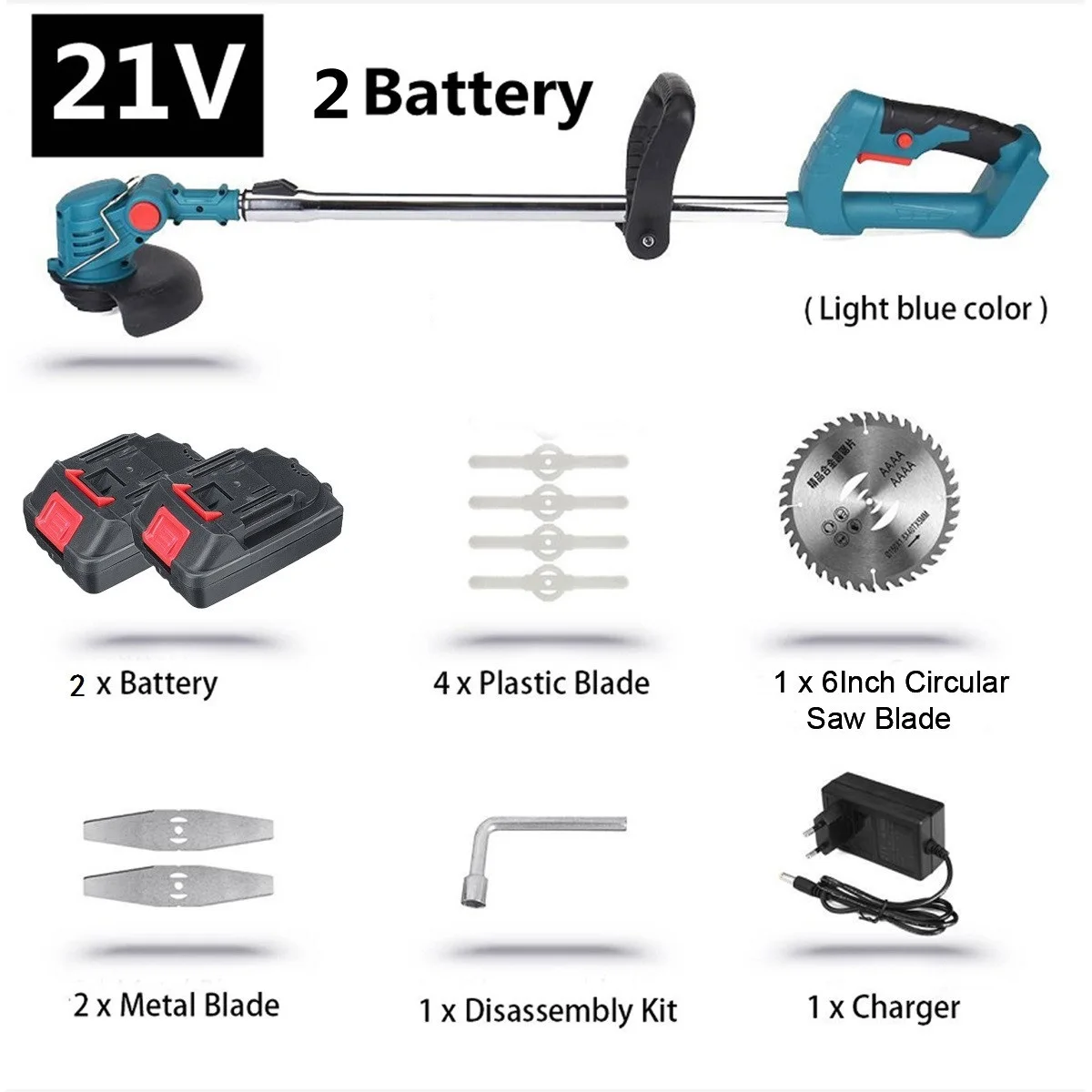 1 х беспроводной электрический триммер для травы1/2 x батареяЗарядное устройство-1 шт.4 x Пластиковые лезвия2 x металлическое лезвие для скашивания1 x легированная пила1 х гаечный ключ (Распределите адаптер в соответствии с вашей страной.)
