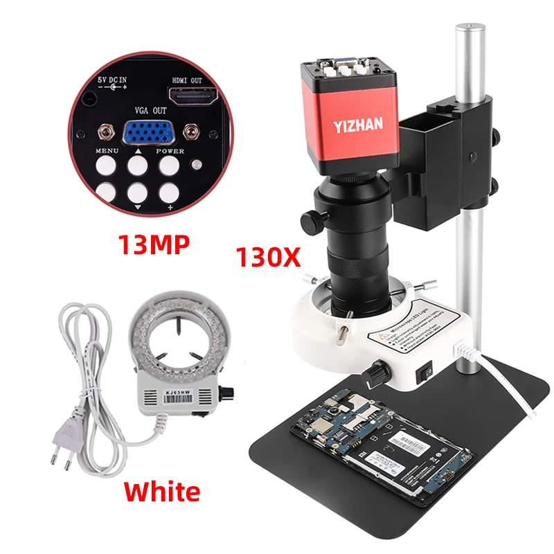 1 * комплект камеры (HDMI VGA 13MP 60Fps)1 * Светодиодный кольцевой светильник (белый)1 * 130X зум-объектив1 * кронштейн микроскопа (29 см * 22 см * 15 см)