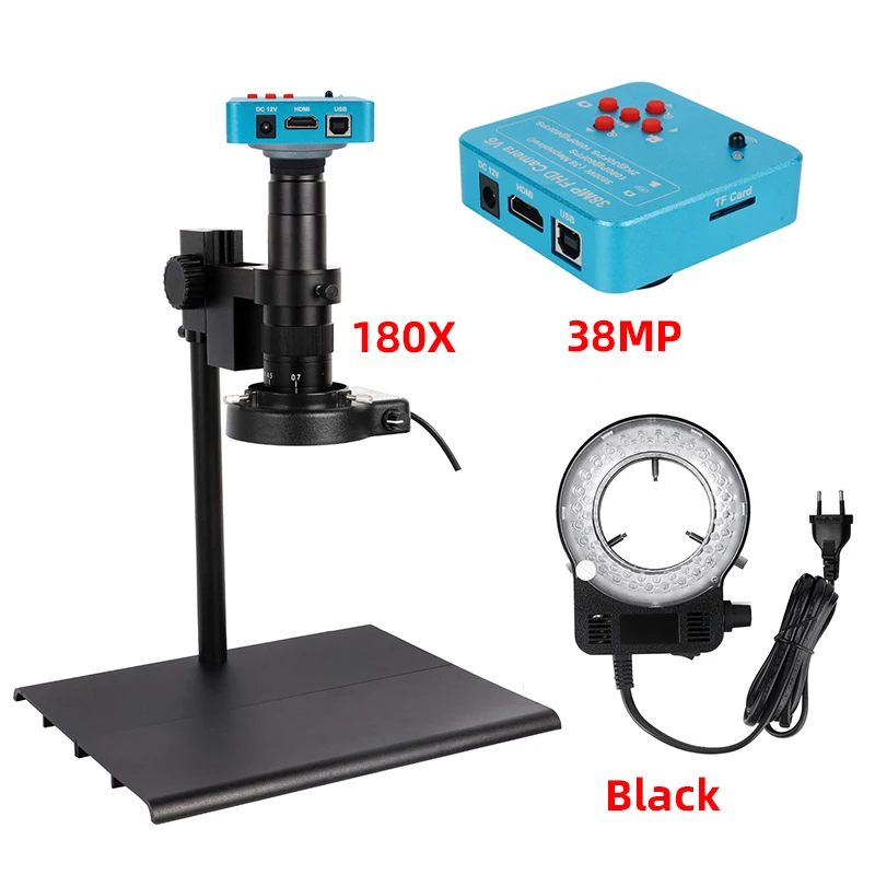 1 * комплект камеры (HDMI USB 38MP 60Fps)1 * Светодиодный кольцевой светильник (черный)1 * 180X зум-объектив1 * кронштейн микроскопа (29 см * 29 см * 26 см)