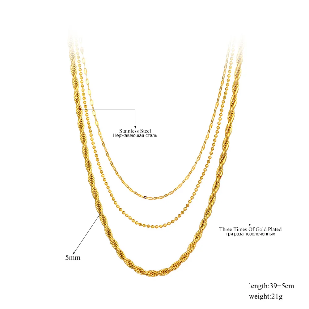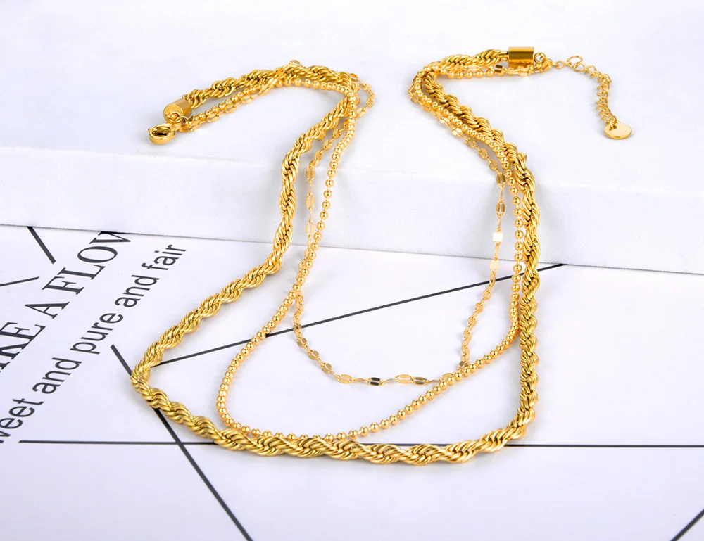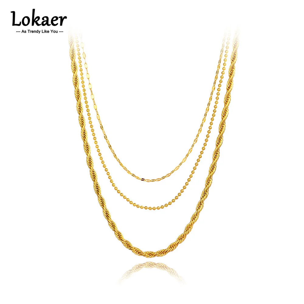 Ожерелья Lokaer в стиле хип-хопрок из нержавеющей стали с тремя искусственными ожерельями, золотистые витые искусственные ожерелья 18 карат для женщин N21248
