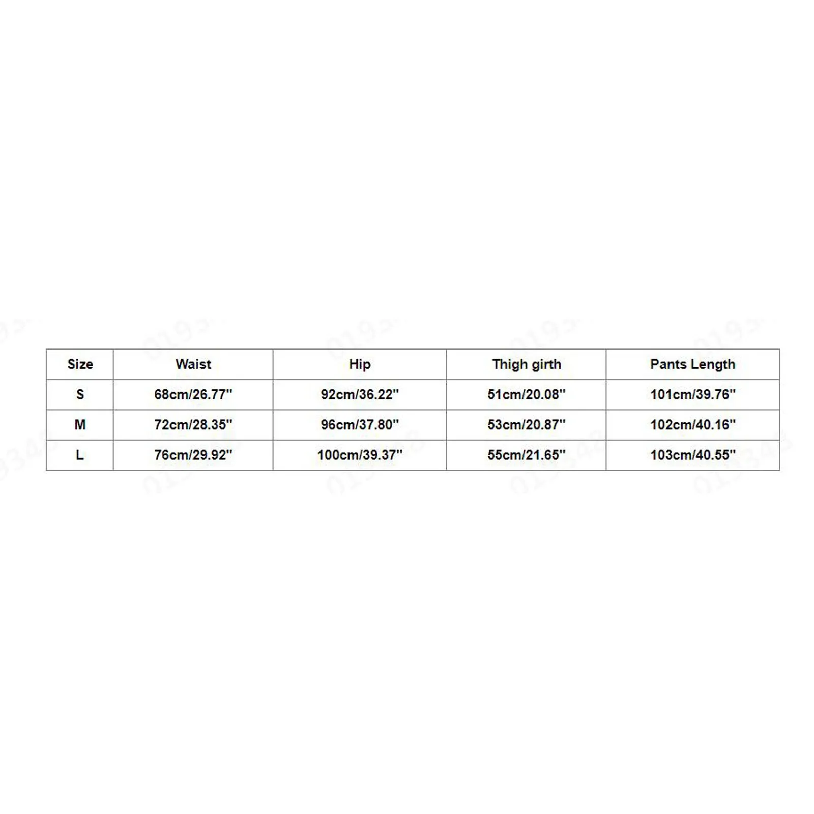 Размер: S Талия: 68 см/26,77 дюйма Обхват бедер: 92 см/36,22 дюйма Обхват бедра: 51 см/202,76 дюйма Длина брюк: 101 см/39,76 дюйма Размер: M Талия: 72 см/28,35 дюйма Обхват бедер: 96 см/37,80 дюйма Обхват бедра: 53 см/13,78 дюйма Длина брюк: 102 см/40,16 дюйма Размер: L Талия: 76 см/29,92 дюйма Обхват бедер: 100 см/39,37 дюйма Обхват бедра: 55 см/21,65 дюйма Длина брюк: 103 см/40,55 дюйма