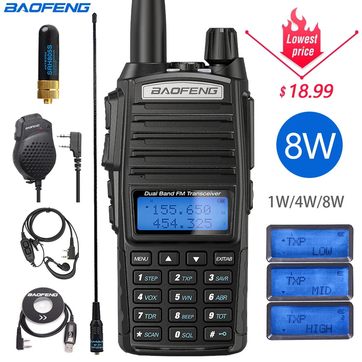 Высокая/средняя/низкая мощность (8 Вт/4 Вт/1 Вт); Частотный диапазон: 65-108 МГц (только коммерческий прием fm-радио) VHF: 136-174 МГц (Rx/Tx). UHF: 400-520 МГц (Rx/Tx). Широкий (широкий)/Узкий (узкий) Двухдиапазонный портативный трансивер с меню функций дисплея на дисплее и ЖК-дисплее. Функция блокировка каналов для работы; BCLO & quot;.<;br/> Абсолютно Новый Baofeng 8 Вт UV-82Plus портативная рация Pofung UV 82 Ham Радио двойная PTT переносная любительская радиостанция <;br/> Основные функции <;br/>01) 100% абсолютно новый и высококачественный <;br/>02) Двухдиапазонный портативный трансивер с меню функций дисплея на дисплее и ЖК-дисплее;<;br/>03) коммерческий fm-радиоприемник (65 МГц-108 МГц)<;br/>04) Частотный режим/Режим канала <;br/>05) DTMF кодирован <;br/>06) Включает 105 кодов & quot;DCS & quot; И 50 кодов конфиденциальности & quot;CTCSS & quot; Программируемые,<;br/>CTCSS & amp; DCS сканирование и CTCSS DCS прямой вход <;br/>07 Функция VOX <;br/>08 экономия батареи <;br/>09 выбор диапазона WideNarrow <;br/>10 тайм-аут (TOT)<;br/>11) Блокировка клавиатуры ATUO <;br/>12) функция блокировки напряженного канала <;br/>13) функция первичного сканирования <;br/>14) предупреждение о низком заряде батареи <;br/>15) светодиодный фонарик <;br/>16) переключение питания с высокой/низкой частотой <;br/>17) Программируемый ПК <;br/>18) Блокировка рабочего канала (BCLO)<;br/>19) встроенный ключ <;br/>20) аккумулятор большой емкости: низкий саморазряд, Отсутствие эффекта памяти, высокий срок службы,<;br/> со специальным дизайном, может использоваться в горячей и холодной области <;br/>General<;br/> Частотный диапазон <;br/>65-108 МГц (только FM получение)<;br/>136-174 МГц и 400-520 МГц (TX/RX)<;br/> номер канала <;br/>128<;br/> Стабильность частоты <;br/>± 2,5 ppm<;br/> Антенна <;br/> двухдиапазонная антенна с высоким коэффициентом усиления <;br/> Сопротивление антенны <;br/>50<;br/> Рабочее напряжение <;br/>DC 7,4 V & lt; 2800MAH Макс <;br/> режим работы <;br/> Простая или полудуплексная <;br/> Антенна: <; Br/>SMA -Female<;br/> наушник/Тип микрофона:<;br/> k-тип штепсельной вилки <;br/> Размеры (Ш x В x Г)<;br/>132*60*35 мм (антенна в комплект не входит)<;br/> Вес <;br/>238 г (включая батарею, антенну)<;br/> адаптер питания <;br/> Вход: AC100-240V, 50-60 Гц;<;br/> Выход: DC10V/500mA;<;br/> Тип вилки: передатчик US/EU/UK/AU<;br/> Выходная мощность <;br/>8 Вт/4 Вт/1 Вт (макс. 8 Вт)<;br/> Режим модуляции <;br/>16kF3E / 11kF3E<;br/> Максимальное отклонение <;br/>5 кГц (в ширину) /2,5 кГц (узкий носок)<;br/> паразитное излучение <;br/>7 Вт <;br/> прилегающие Ch. Мощность <;br/>-65 дБ (широкая) / -60 дБ (узкая)<;br/> характеристики предварительного акцента <;br/>6 дБ <;br/> сила тока <;br/>1.6A(5 Вт)<;br/>CTCSS/DCS отклонение <;br/> 0,5 ± 0,1 кГц (широкий)/0,3 ± 0,1 кГц (узкий)<;br/> чувствительность посредника <;br/> 8-12мв <;br/> искажение посредника <;br/>10%<;br/> посылка:<;br/>1 X портативное радио <;br/>1 X Антенна <;br/>1 X литий-ионный аккумулятор <;br/>1 X литий-ионное зарядное устройство <;br/>1 X Зажим для ремня <;br/>1 X слинг <;br/>1 X Руководство пользователя <;br/> и другие аксессуары зависят от вашего выбора в Ссылка