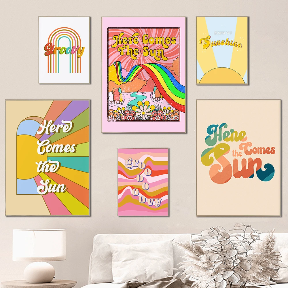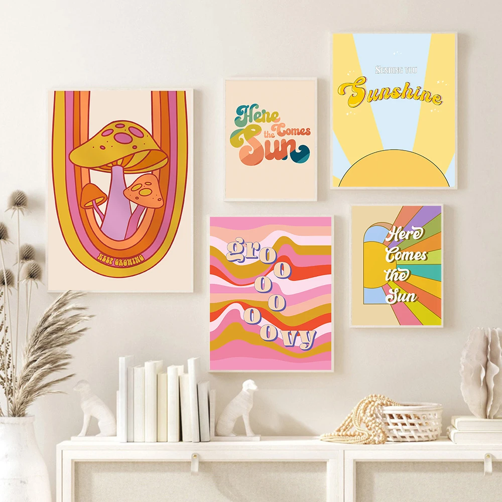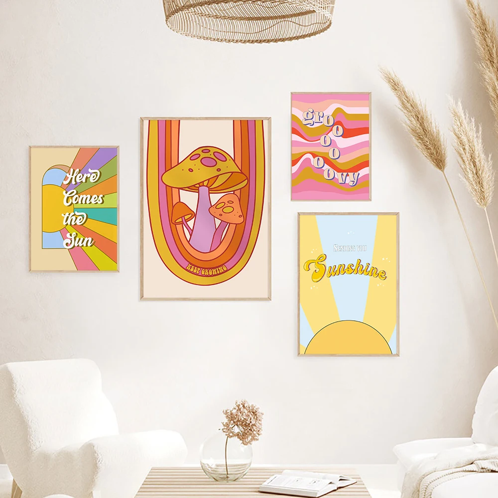 Boho 70s Groovy Ретро красочная Радужная Цитата типография плакат в стиле хиппи Настенная картина Симпатичные грибы Холст Картина гостиная домашний декор