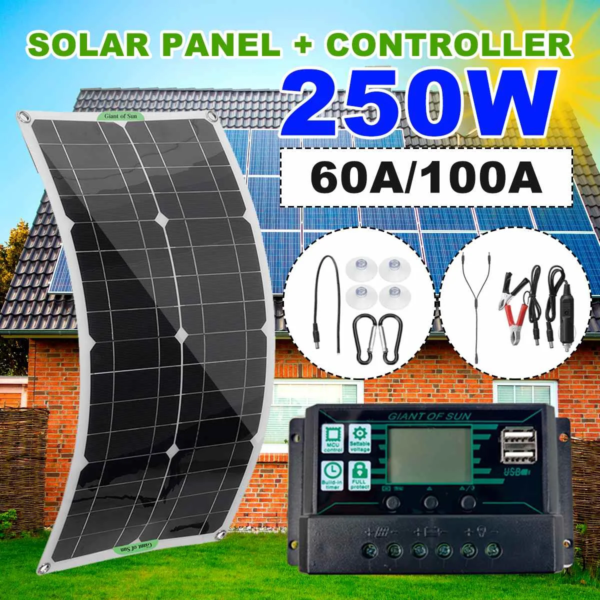 250W Панели солнечные комплект в комплекте с блоком питания постоянного тока 2 в 1 линия 60A/100A контроллер 24/12/5V Dual USB Автомобильное зарядное устройство Порты и разъёмы на открытом воздухе Порты и разъёмы в состоянии Батарея Зарядное устройство