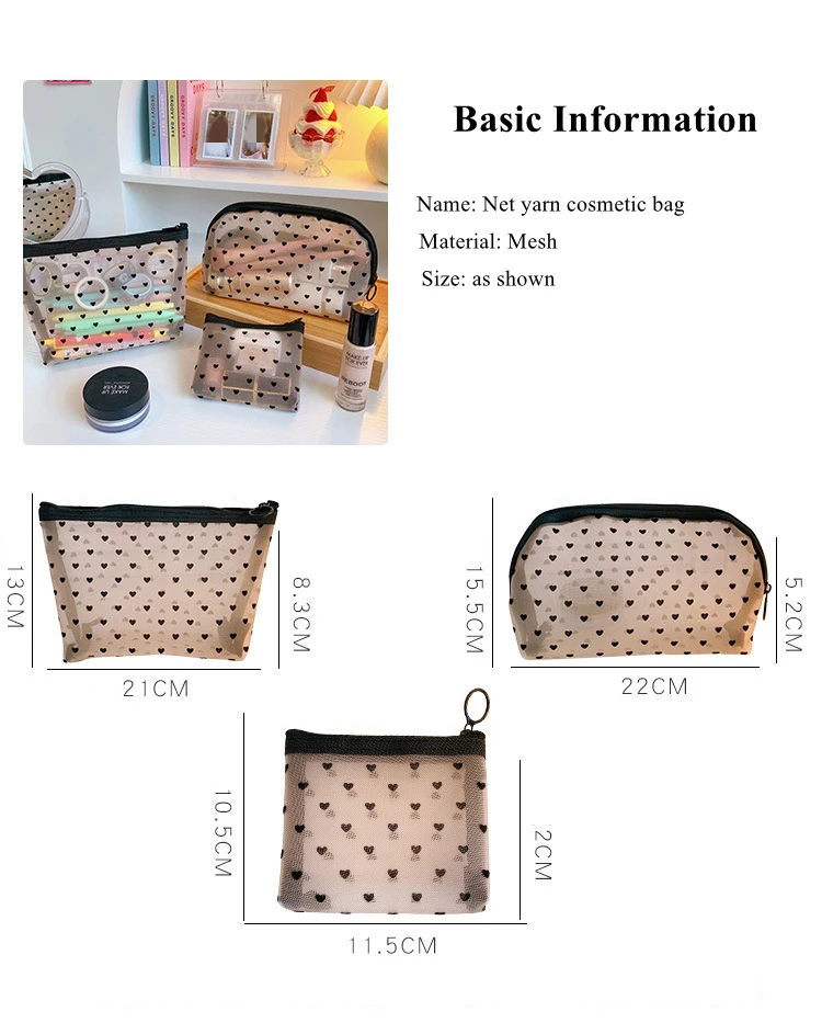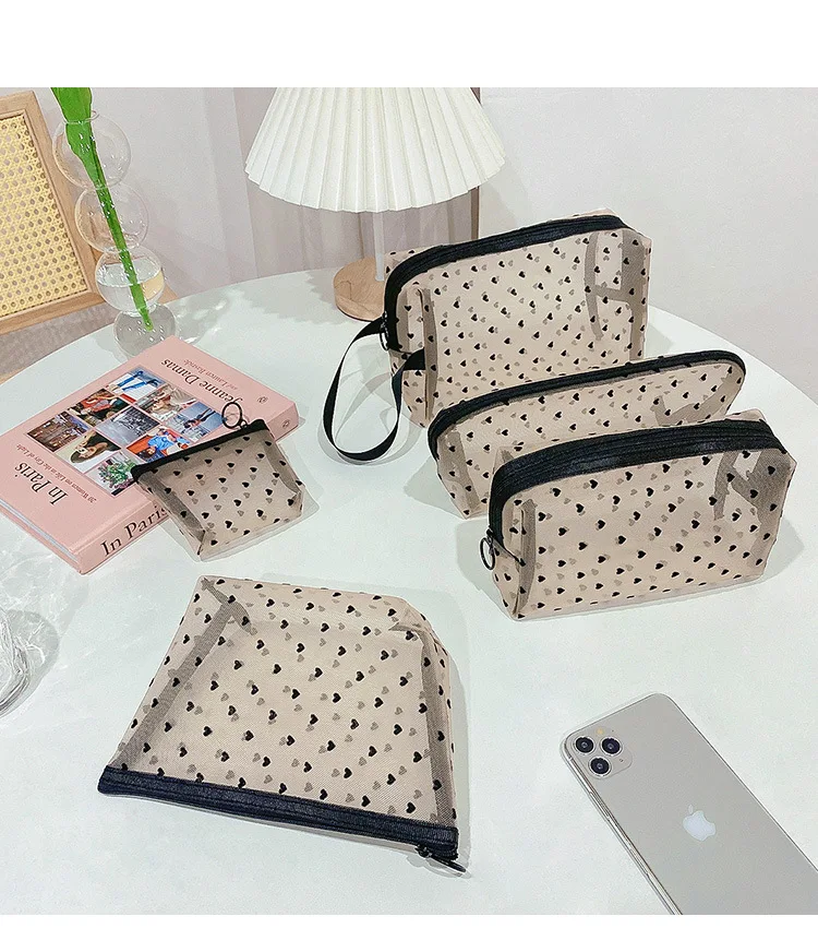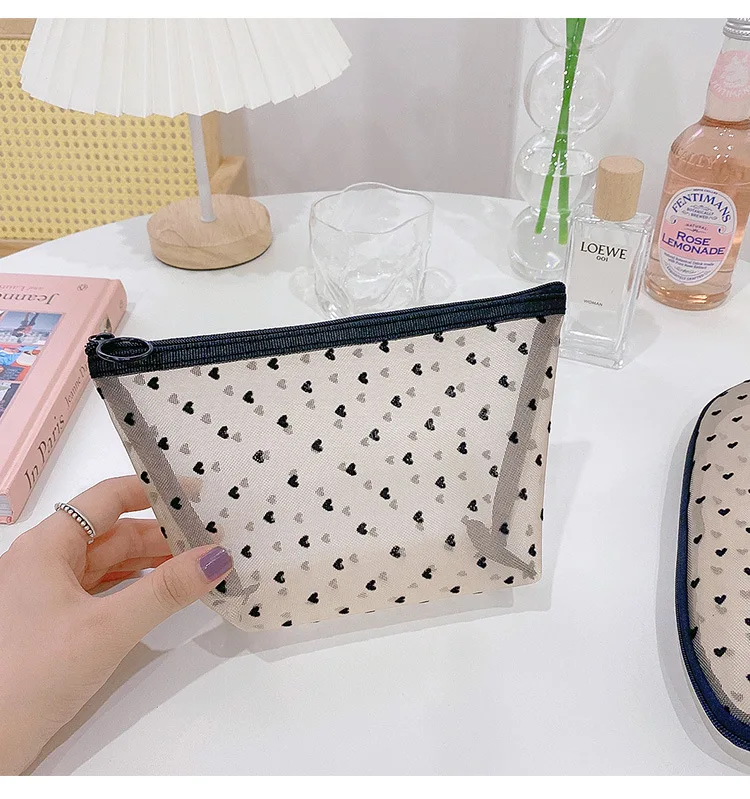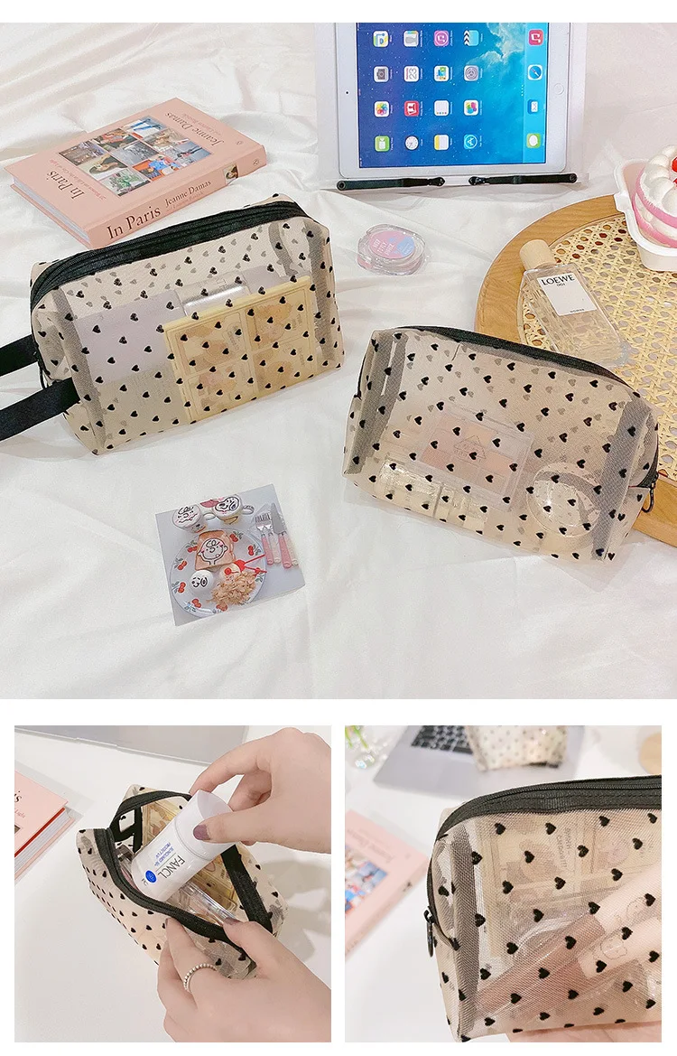 Необходимая женская косметичка, прозрачный дорожный Органайзер, модные сумки для туалетных принадлежностей, сетчатая косметичка с принтом в виде сердца, сумки для хранения