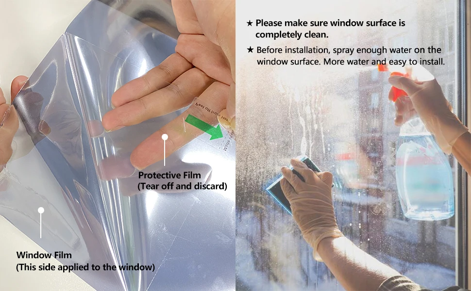 Без клея, легко устанавливается и снимается-Нетканая оконная пленка без клея и удобна в использовании, чтобы избежать выброса химических веществ. Очень легко установить. Вам нужно только немного воды (мыльная вода будет лучше), чтобы применить его.