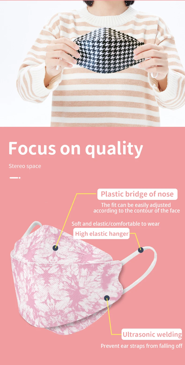 Эта маска имеет уникальный дизайн обтекаемой резки, который может изменить форму лица и не испортит ваш макияж!Модная печатная маска KN95 (индивидуально упакованная)Материал: Нетканое полотно, выдунное из расплава полотноСкорость фильтрации: больше или равна 95%.Параметры: 10 шт./пакетРазмер маски: 205*80 ммФункция: Пыленепроницаемость, защита от капель, защита от автомобильных выхлопных газов, пыльца и другие вредные частицыОсобенности маски:1. Регулируемый переносица, высокая герметичность, лучше подходит для носа, предотвращает частицы от использования зазора, чтобы увеличить комфорт при ношении2. Высокая эластичная лента, удобная, прочная и не сломана.3. Четырехслойный фильтрующий материал, ткань удобная, безвкусная и не раздражает кожу4. Отсутствие запаха и стимуляции, эффективная изоляция вредных частицВопросы, требующие внимания: Вопросы, требующие внимания:1. Этот продукт не моется. Пожалуйста, убедитесь, что вы используете его в течение срока действия.2. Хранить в сухом и проветриваемом месте, вдали от источников огня и легковоспламеняющихся материалов3. Из-за различных производственных партий и мониторов, продукты могут иметь определенные хроматические аберрации, пожалуйста, поймите