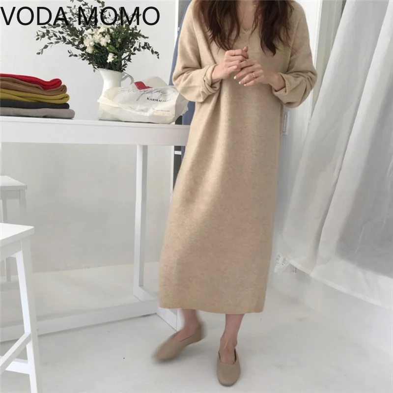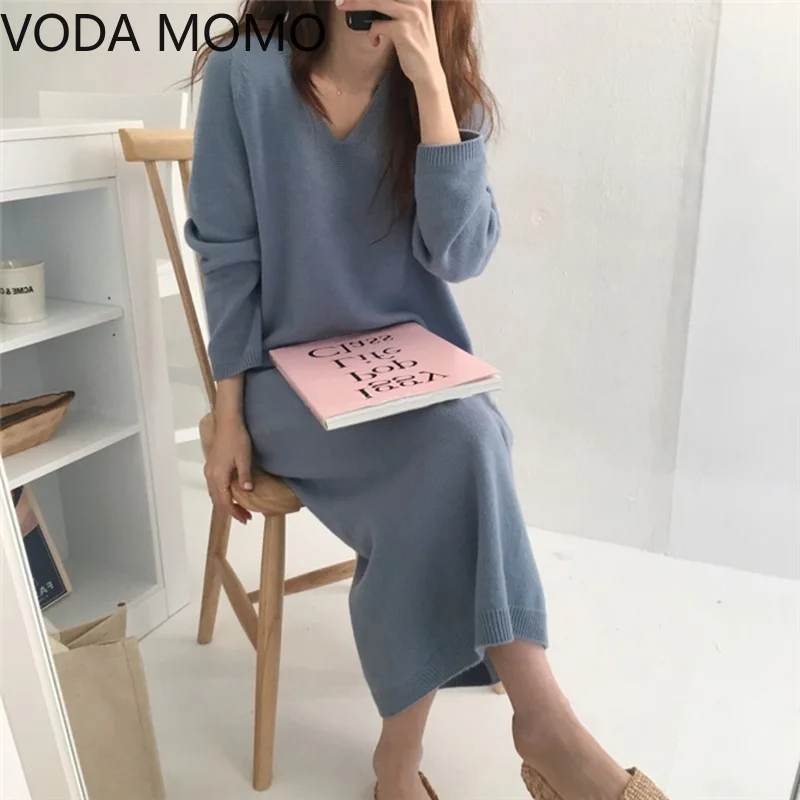 Женское трикотажное платье-свитер с V-образным вырезом и длинным рукавом