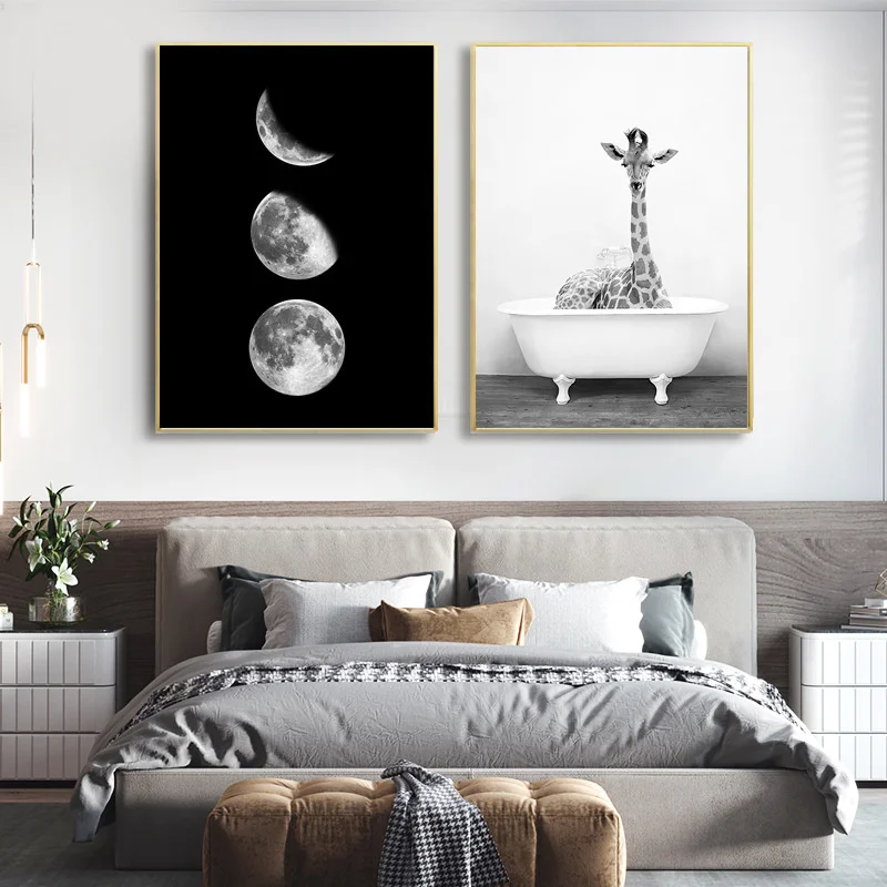 Модный сексуальный постер для женщин, картина с изображением Луны, Кита, жирафа, ванной, Геометрическая Картина на холсте, простое черно-белое украшение для дома