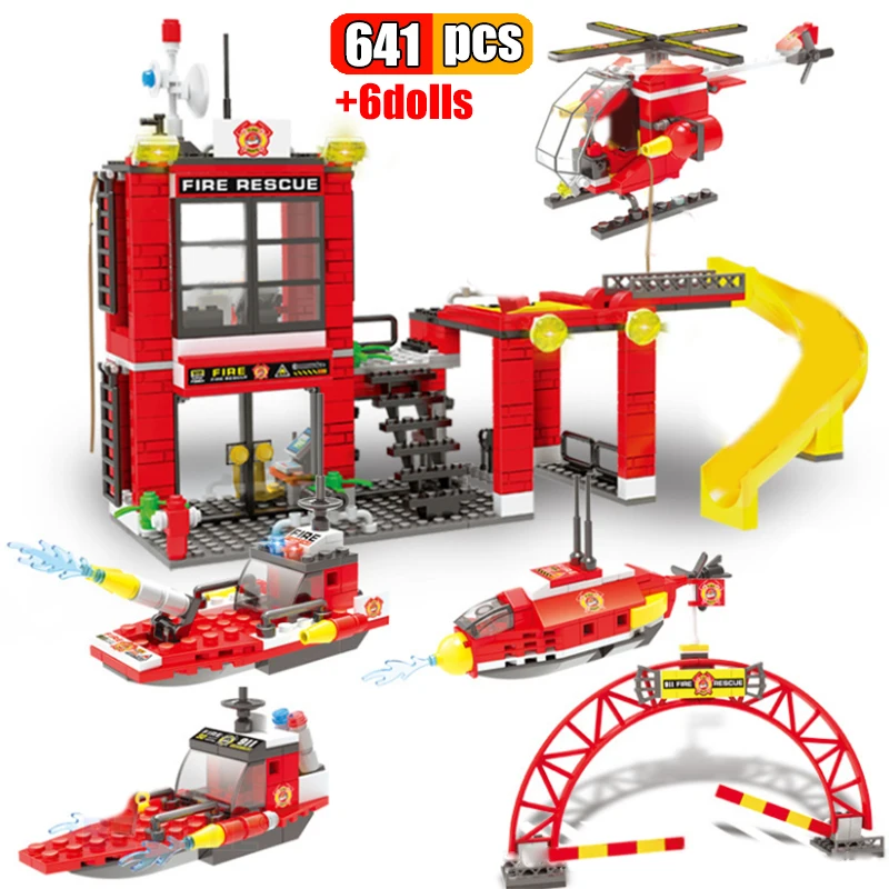 Детский конструктор пожарные машины, пожарная станция, вертолет, Лодка