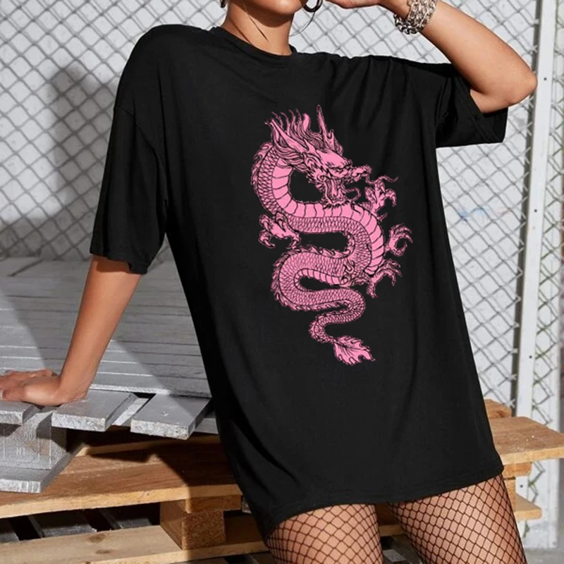 Футболка женская оверсайз с принтом, готический топ с розовым драко...