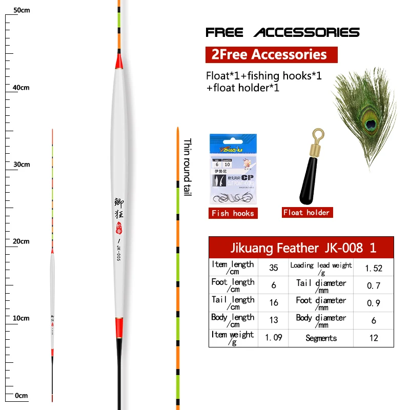 JK007-size1Длина изделия: 35,0 см, длина стопы: 6,0 см, длина хвоста: 15,5 см, длина: 13,5 см, артикул Вес: 0,93 г, нагрузка на свинцовый Вес: 1,0 г, диаметр: 1,0 мм, диаметр корпуса: 5,4 мм, диаметр хвоста: 0,6 мм, сегменты: 12JK007-size2Длина изделия: 35,5 см, длина стопы: 6,0 см, длина хвоста: 15,5 см, длина: 14,0 см, артикул Вес: 0,94 г, нагрузка на свинцовый Вес: 1,35 г, диаметр: 1,0 мм, диаметр корпуса: 5,7 мм, диаметр хвоста: 0,6 мм, сегменты: 12