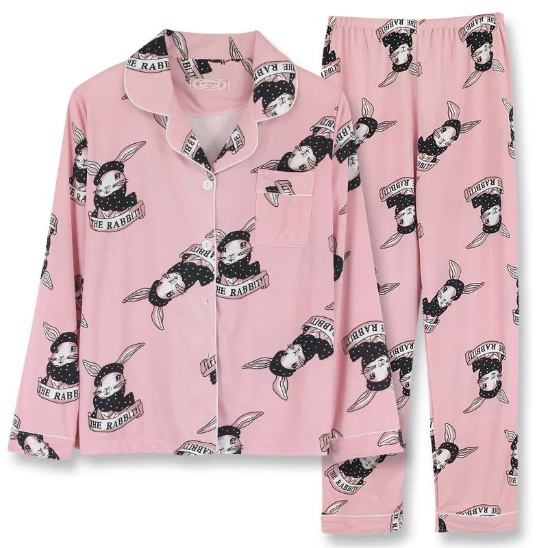 Женский пижамный комплект, женская пижама с мультяшным принтом кролика, женская одежда для сна, топ, модная домашняя одежда в горошек, длинная рубашка и брюки, 2 шт.компл.