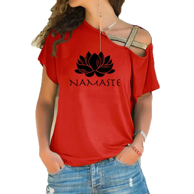 Модная женская одежда с принтом Namaste, футболка, Женский Топ, женская одежда с коротким рукавом, асимметричная перекрестная бандажная футболка