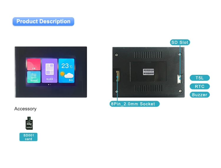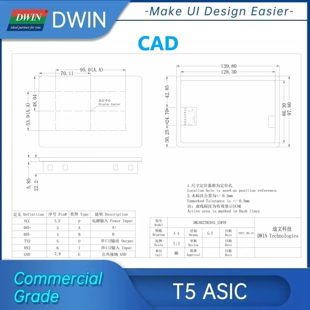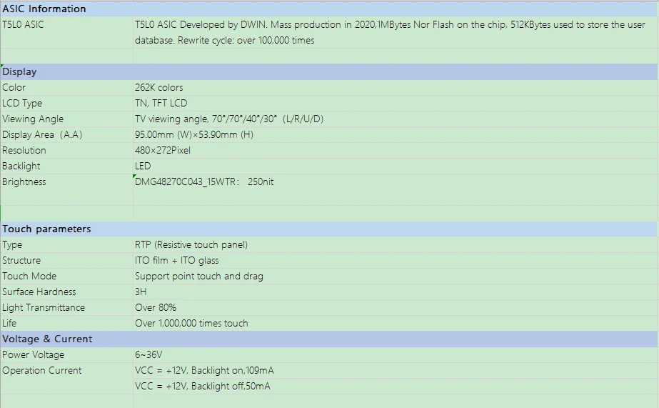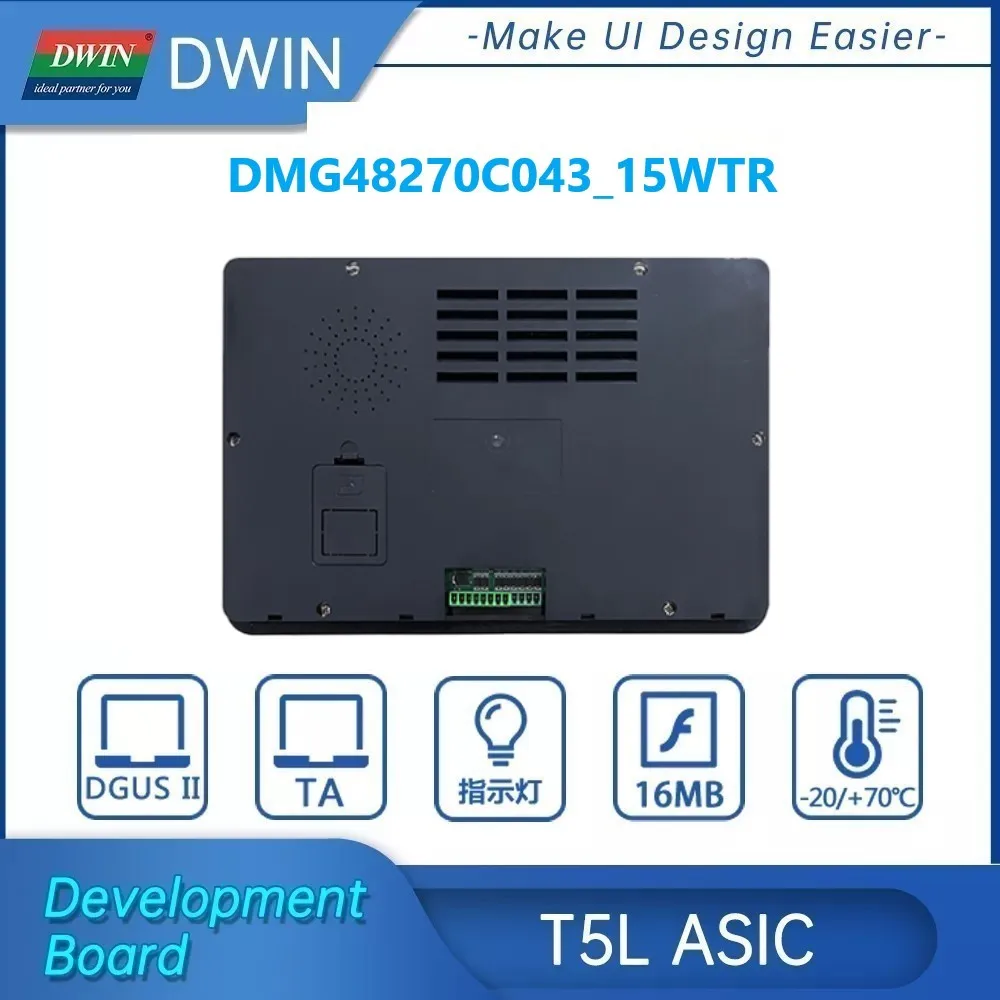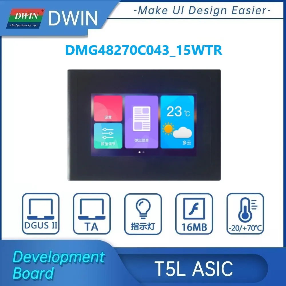 DWIN 4,3 дюймов 480x272 Разрешение, 262 к цветной сенсорный экран, Промышленный высокий стандарт на тонкопленочных транзисторах на тонкоплёночных транзисторах ЖК-дисплей модуль Дисплей HMI Резистивный/ёмкостный сенсорный панель. DMG48270C043_15WTR-это интеллектуальный Резистивный/емкостный сенсорный экран с портом UART, который может управляться любым MCU с помощью команды, поэтому его можно использовать в качестве TFT дисплея и сенсорного контроллера в различном электронном оборудовании. Панель ЖК-дисплея, сенсорный ЖК-экран, дисплей DWIN-ваш лучший выбор для проекта HMI. DMG48270C043 _ 15WTR ЖК-дисплей на основе процессора DWIN T5L с двухъядерным графическим интерфейсом и ОС. Ядро GUI может поддерживать дизайн интерфейса на основе мощного программного обеспечения DWIN design, включая данные, текст, кривые, базовую графику, загрузку ключа, И т. Д. Ядро ОС можно открыть клиенту для второй разработки в сборке ОС, и это улучшает функциональность графического интерфейса. Все MCUs могут подключаться к интеллектуальному дисплею DWIN.