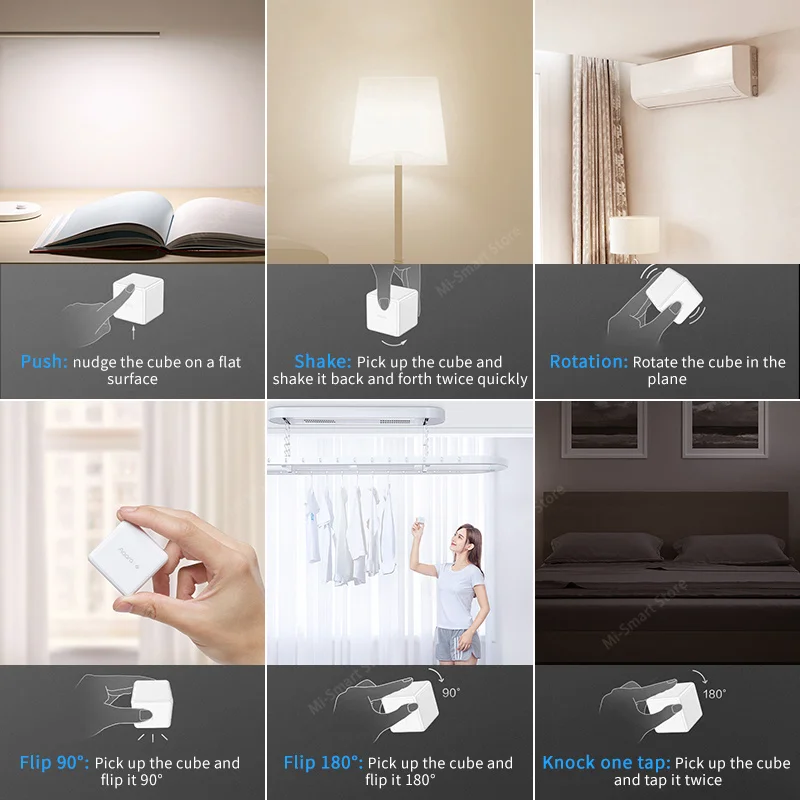 ● Нажмите, ВКЛ/ВЫКЛ mijia настольная лампа* Эта функция должна работать с настольной лампой mijia● Встряхивание, переключатель жалюзи* Эта функция должна работать с мотором для штор aqara● Поверните и настройте яркость* Эта функция должна использоваться с умными лампами mijia● Стук, включение/выключение кондиционирование воздуха* Эта функция должна использоваться с mijia air conditioning partner● Поверните 90 °, чтобы открыть очиститель воздуха* Эта функция должна использоваться с воздухоочистителем● Флип 180, режим сна