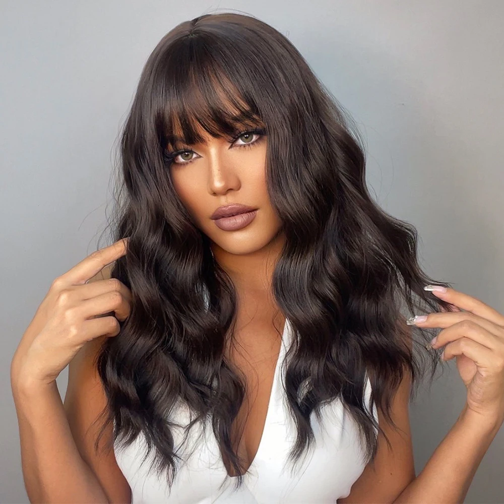Парик LOUIS FERRE с длинными волнистыми волосами и челкой, термостойкий синтетический, темно-коричневый, для повседневной вечеринки, косплея, искусственные волосы для чернокожих женщин