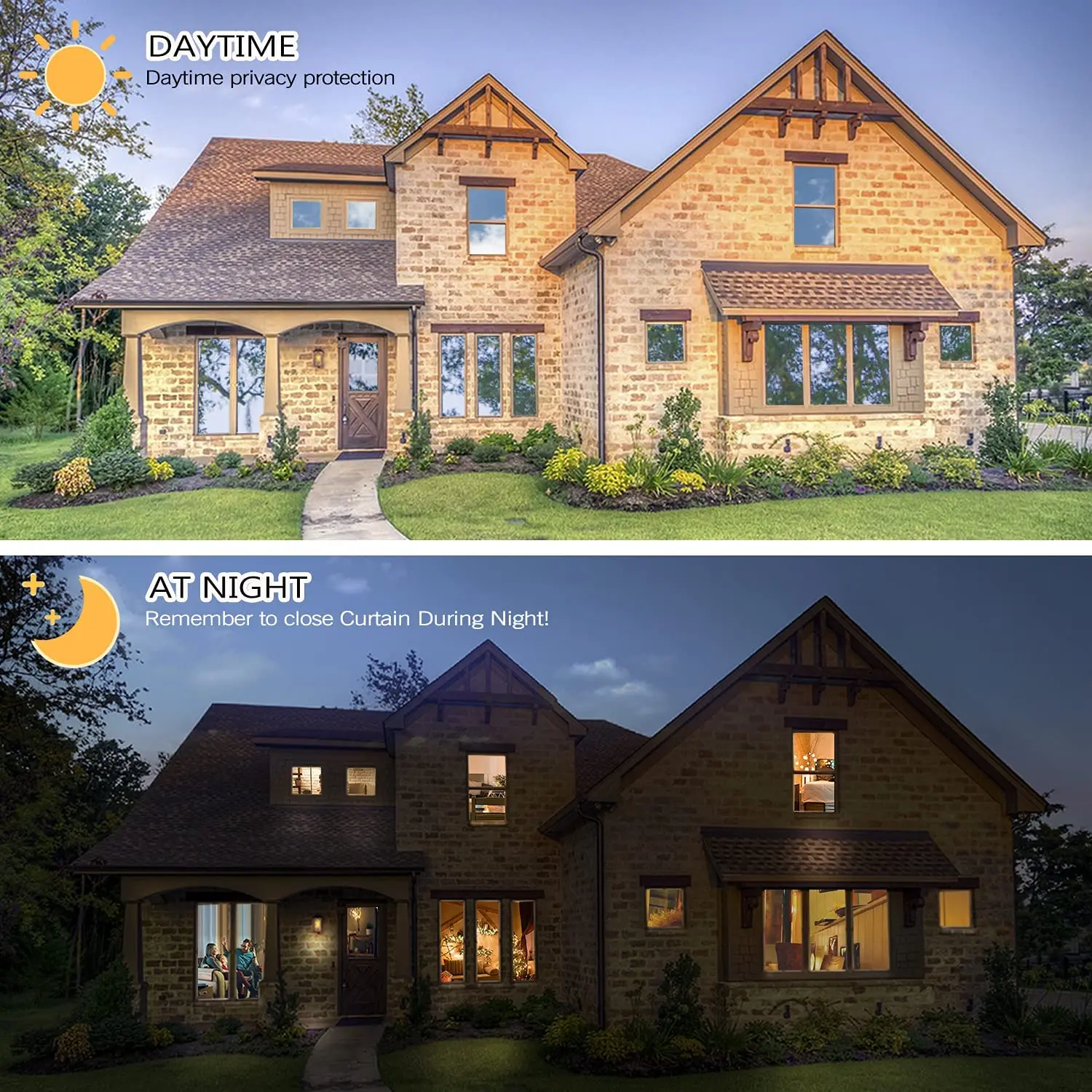 Когда внутренний светильник прочнее, чем снаружи, зеркальный эффект меняется, односторонняя оконная пленка не может обеспечить защиту конфиденциальности, снаружи люди могут видеть внутри. Пожалуйста, не забудьте закрыть шторы ночью или облачно.