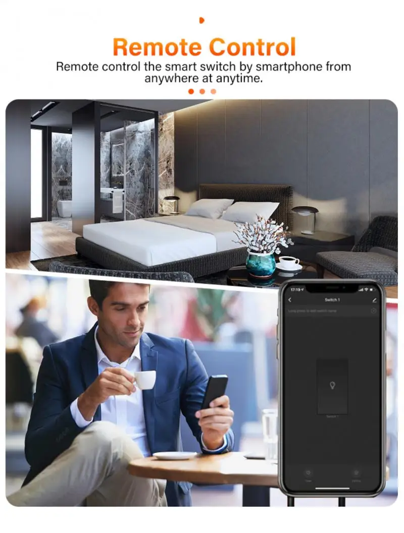 Управляйте включением и выключением устройства, синхронизацией, обратным отсчетом и другими функциями через мобильный телефон. Пока мобильный телефон имеет сеть, модуль переключателя дома можно контролировать по всему миру.