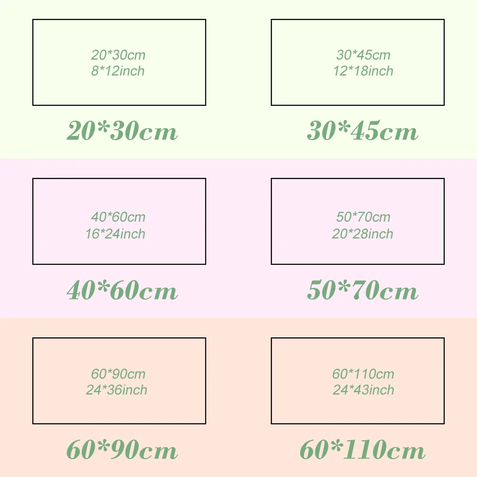 3. Размеры (как показано на рисунке ниже): 8*12 дюймов-20*30 см; 12*18 дюймов-30*45 см; 16*24 Дюймов-40*60 см; 20*28 дюймов-50*70 см; 24*36 дюймов-60*90 см; 24*43 дюймов-60*110 см