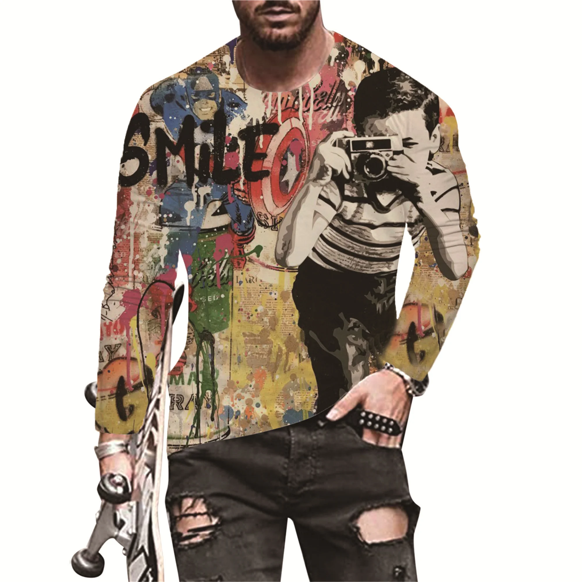 Новинка 2020, мужские повседневные спортивные футболки с рисунком масляной живописи, уличные трендовые Футболки с длинным рукавом и цифровым принтом