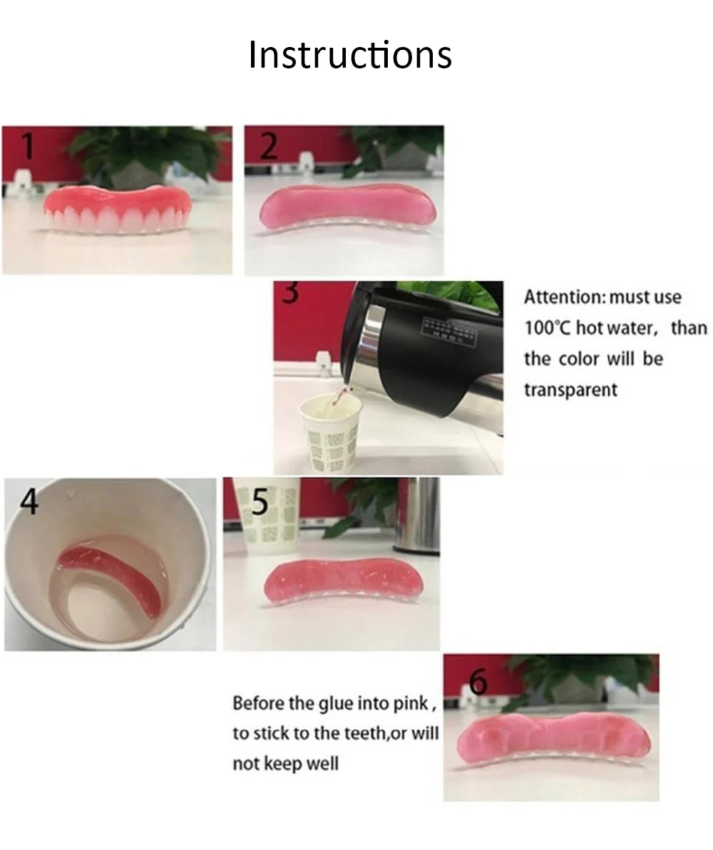 Наименование товара: виниры для мгновенной улыбки, косметические зубные шпоны для женщин и мужчин, удобная верхняя и нижняя шпонИнструкции:1.Положите Гутту перча в теплую воду, чтобы расплавить и смягчить, затем приклейте егоПротез сначала, а затем Наклейте его на человеческие зубы, его можно использоватьМногократно2. Роль белого прорезывателя заключается в плавлении в гель после попадания в воду, который используется для приклеивания зубных протезов.