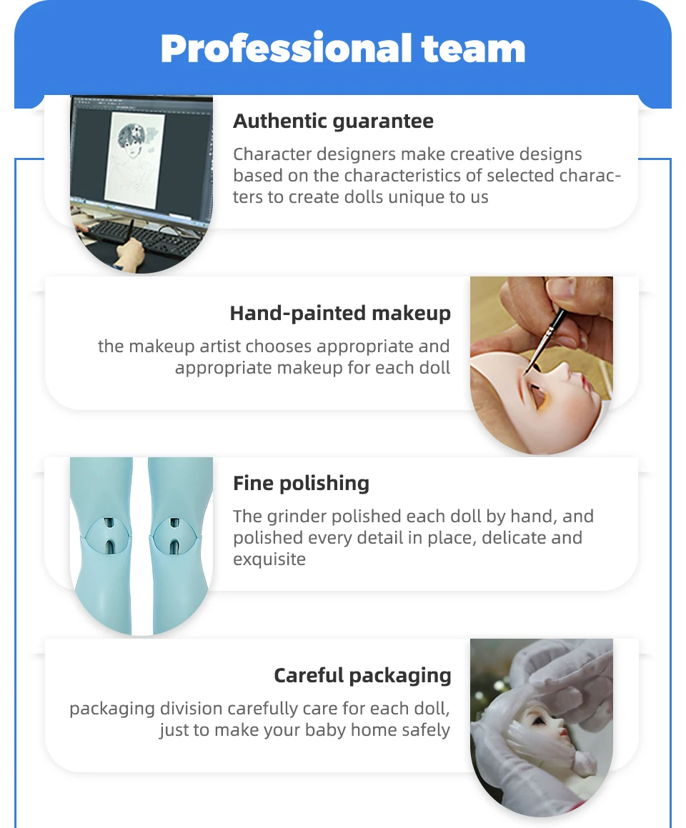 1. Сильная команда: фокусируется на кукле BJD более 10 лет, интегрирует r & d, дизайн, производство и продажи; Владеет оригинальным старшим художником, моделями, комодом, визажистом, от создания, дизайна, до формы, формовки, шлифовки, макияжа, А затем к дизайну одежды и производству до сот рабочих процедур, таких как шитье, моделирование, все завершенные опытными мастерами, представлены вашей кукле BJD каждый стиль уникален и высоко Эстетическая ценность искусства.2. Отборные высококачественные исходные материалы: отборная Высококачественная смола, изысканная и гладкая, удобная на ощупь.3. Изысканный трехмерный макияж: профессиональная команда макияжа, передовые чистые ручные технологии распыления, чтобы создать реалистичный тонкий макияж!4. Переменное моделирование DIY: гибкие соединения, сильная пластичность, различные части могут быть преобразованы по желанию и позе; Также можно изменить макияж, одежду, глаза, волосы и стайлинг.5. Персонализированные настройки: ручная работа, в соответствии с вашими требованиями, настроить вашу эксклюзивную куклу BJD.6. Изысканная подарочная упаковка: фирменная официальная Изысканная упаковочная коробка, Подарочная новая сфера, более красивая и приличная.