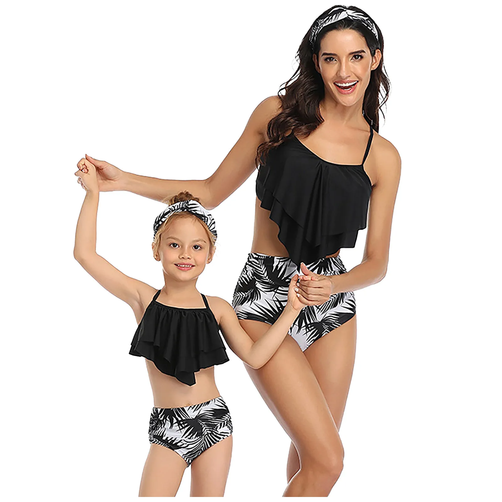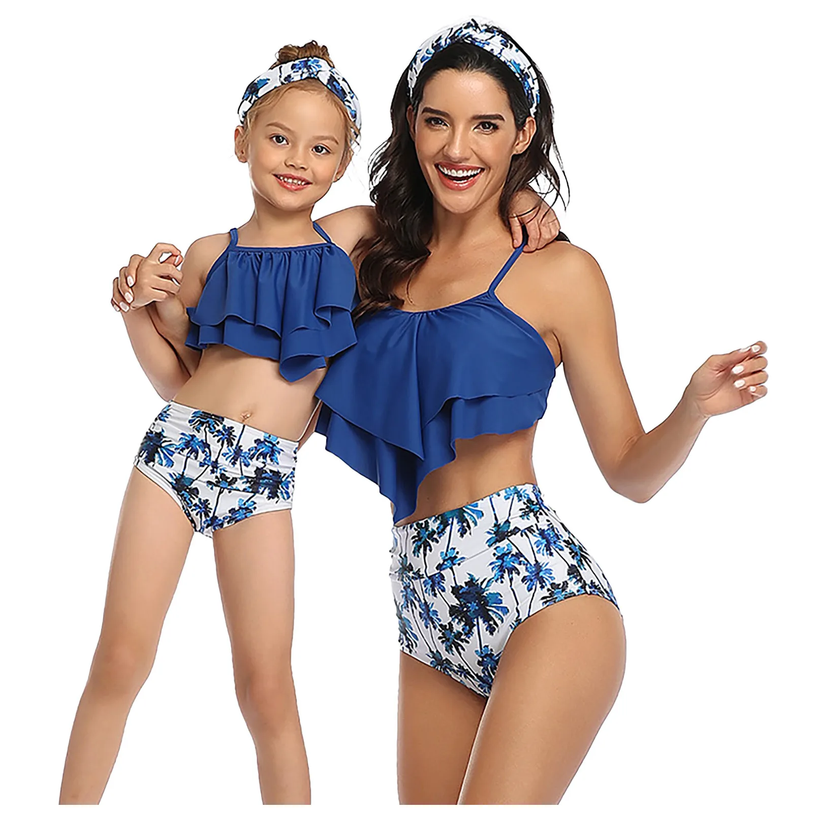 Семейные парные купальники, бикини 2022, купальники-танкини с оборками, Женский комплект бикини с высокой талией, купальный костюм для девочек