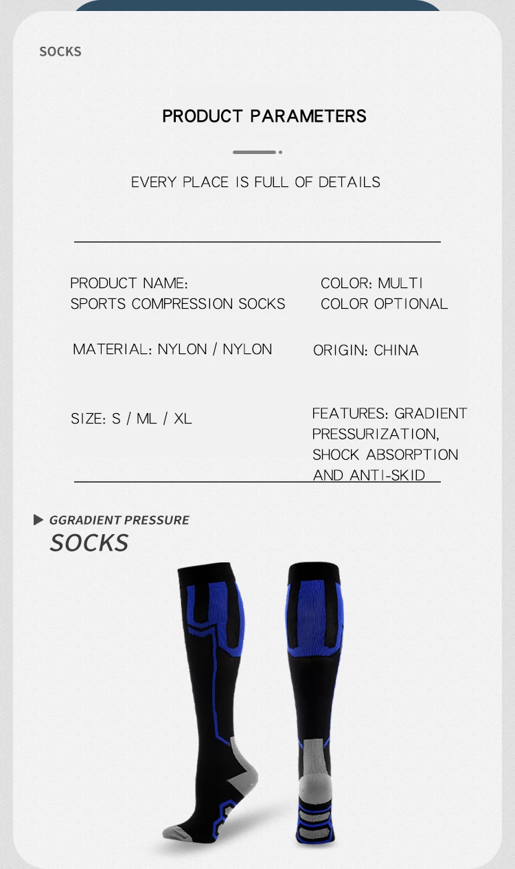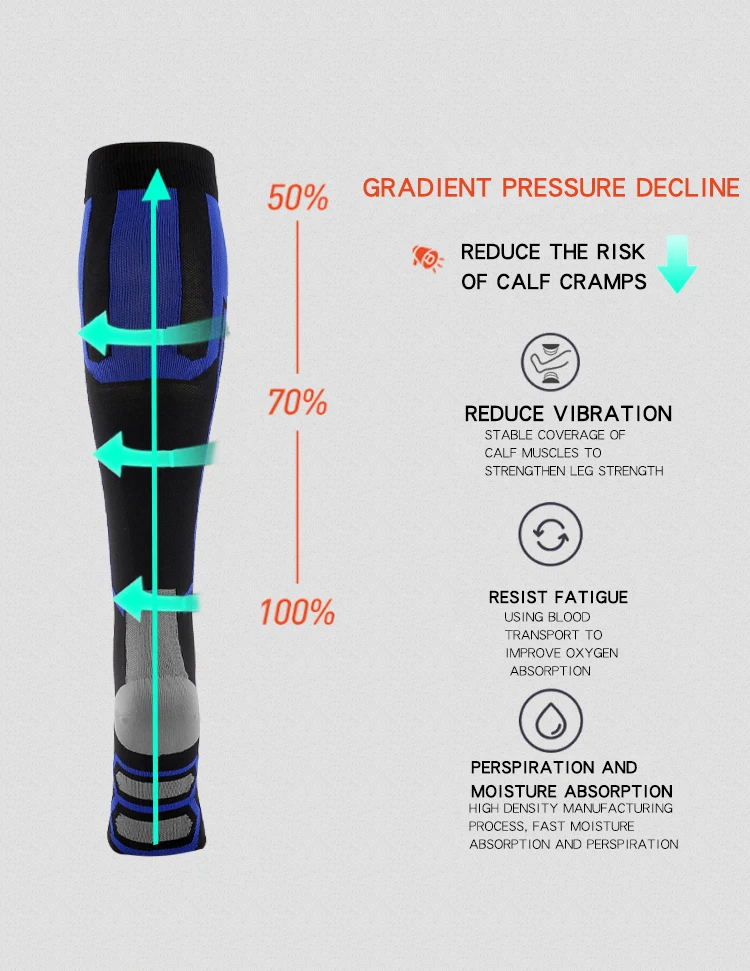 Какой уровень выбрать?Первый уровень (20-30 мм рт. Ст.): подходит для профилактики здоровья у людей. Например, учители, сотрудники ГИБДД, медсестры, доктора, косметологи, торговые гиды и т. д., и эти носки также подходят для ранних симптомов, таких как венозные сосуды с небольшой нижней конечностью, стоя слишком долго, ощущая болезненностьУровень 2 (30-40 мм рт. Ст.): для тех, кто имеет очевидные признаки в нижних конечностях и сопровождается дискомфортом ног (например, боль в конечностях, усталость, отеки и экземы, судороги, покалывание, пигментация, И т. Д.), флебит, беременность, после эксцизии вены, и синдром тромбоза глубоких вен.Уровень 3 (40-50 мм рт. Ст.): подходит для людей с высокими отеками, затемненной кожей и необратимыми лимфемами.Почему все больше и больше людей любят носить компрессионные носки сейчас?Независимо от того, являетесь ли вы спортсменом, который хочет преуспеть в игре, который сидит долгое время во время путешествий или на работе, или кто-то, кто борется с болью из-за хронического состояния, поддержка правильного кровотока на ноги имеет первостепенное значение. Наши компрессионные носки разработаны с новейшей технологией сжатия от свода до икры, Предлагаем адресную поддержку голени и мышц, помогает сохранить поток крови, чтобы повысить атлетическую производительность и облегчить боль из-за ряда условий.Снижает риск травмОбеспечивает дополнительную компрессионную поддержку для стабилизации свода, лодыжки и мышц. Минимизирует колебания мышц и micro-tearing.Prevents спазмов и травм. Усиленная поддержка может предотвратить травмы из-за плохой силы мышц, особенно во второй половине марафона.Улучшает вашу производительностьДля спортсменов на выносливость ключевым механизмом является «икроночный мышечный насос»-с каждым шагом или педальным ударом, сжимающий и разжимающий телячьи мышцы сдавливает кровь обратно к сердцу. Наши компрессионные носки обеспечивают дополнительное сжатие, которое усиливает это действие накачки, ускоряя поток очень необходимого кислорода для работы мышц. Ускоряет кровообращение к сердцу и избавляет от метаболических отходов от мышц.Помогает быстрее восстановитьсяСтимулирует кровоток и улучшает доставку кислорода в ваши мышцы. Уменьшает выработку молочной кислоты, мышечную болезненность и чувство тяжеловесности в ногах и ногах. Более быстрое восстановление от «задержки начала мышечной болезненности».Помогает предотвратить или снять отекиПомогает контролировать отек через улучшенную циркуляцию и ускоряет удаление клеточных отходов. Уменьшает отеки и усталость от длительного сидения или стоя. Идеально подходит для беременных женщин и тех, кто сидит или стоит в течение длительного периода во время путешествий или на работе.Помогает облегчить боль в подошвенном фасциитеРазработан с компрессией, чтобы помочь в управлении болью и облегчении от подошвенного фасцита, пятки шпоры и боли в суставах. Помогает при стоянии и ходьбе. Сжатие связок уменьшит воспаление, ускоряя процесс заживления.Которые могут извлечь выгоду из компрессионных носков:1. Беременная женщина2. Спортсмены и активные люди занимаются спортом, бегом, пешим туризмом, велоспортом, футболом и т. д.3. Частые путешественников или тех, кто летает на длинном самолете4, рабочие места, которые требуют от вас быть на ногах много: мед
