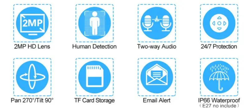 1. Функция: держатель лампы является универсальным держателем лампы E27, прост в установке, две лампы поддерживают освещение, угол панорамного поворота 270 градусов, мобильный телефон с дистанционным просмотром, Wi-Fi ссылка, интеллектуальное обнаружение движения человека и аномальная сигнализация экрана, камера может автоматически отправлять сигнал, когда кто-то ломается и мигает, Интеллектуальный двусторонний голосовой Интерком в режиме реального времени, 2 миллиона пикселей высокой четкости, максимальная поддержка карты памяти 128G, поддержка облачного хранилища и хранения tf-карт.