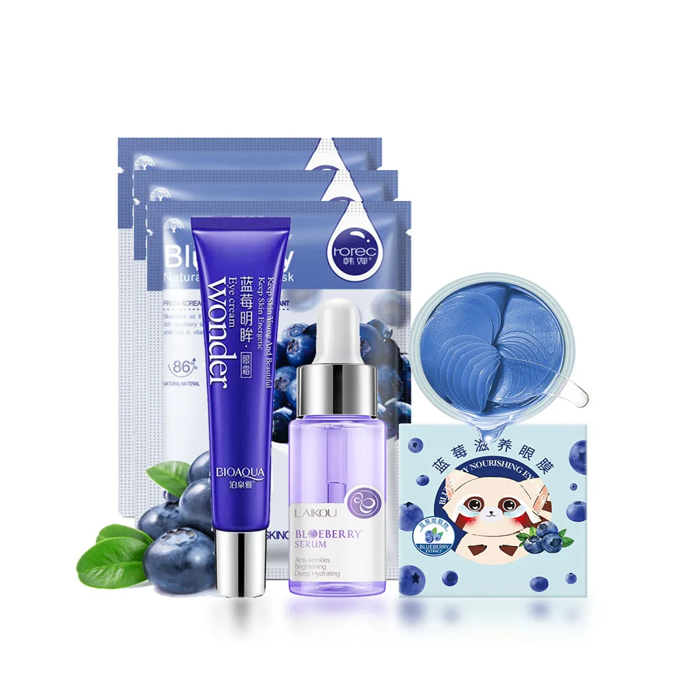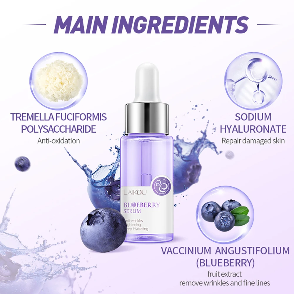 【Черничная Сыворотка для лица 15 мл 】содержит гиалуронат натрия, тримеллу фуциформис полисахарид и экстракт плодов черники, сыворотка голубики LAIKOU улучшает увлажнение кожи, глубоко увлажняет и снимает сухость кожи. Благодаря функции осветления и омолаживания, он может уменьшить морщины лица, осветлить и ровный тон кожи, делая вашу кожу гладкой и нежной.【Черничный крем для глаз 20 г 】 натуральный экстракт черники, водянистый и тонкий, мягкий и мягкий, пополняет воду, выцветает темные круги вокруг глаз, морщин, уход за кожей вокруг глаз.【Черничная маска для лица 5 шт. 】 увлажнение и увлажнение, гелевая сухость и укрепление мышечного блеска кожи красивая и гладкая. 【Маска для глаз из черники 60 шт. 】 натуральный экстракт черники, пополняет воду, подтягивает глаза. Выцветают темные круги вокруг глаз, морщинки, уход за кожей вокруг глаз.