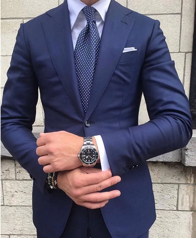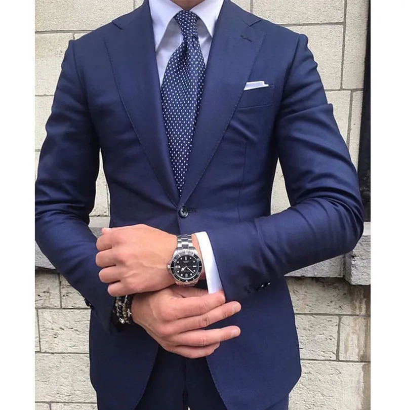 Мужской темно-синий облегающий костюм из 2 предметов, Официальный деловой Блейзер, свадебный смокинг для жениха, мужские модные костюмы, куртка с брюками, 215