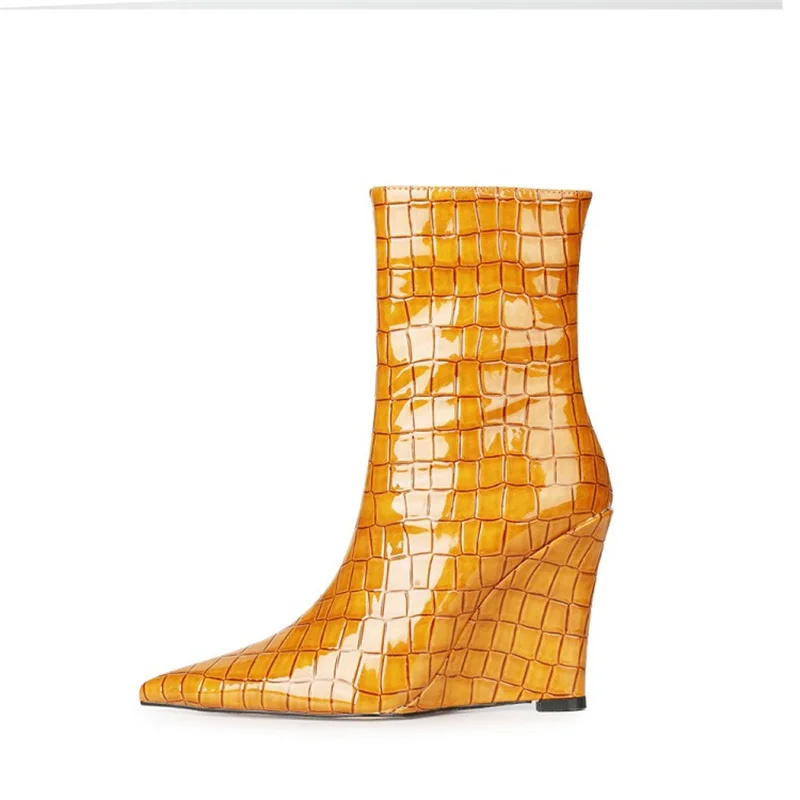 Женские ботильоны на танкетке, неоново-оранжевые ботинки до середины икры с узором под крокодила, на вулканизированной подошве, с острым носком, на молнии, в клетку, 2022