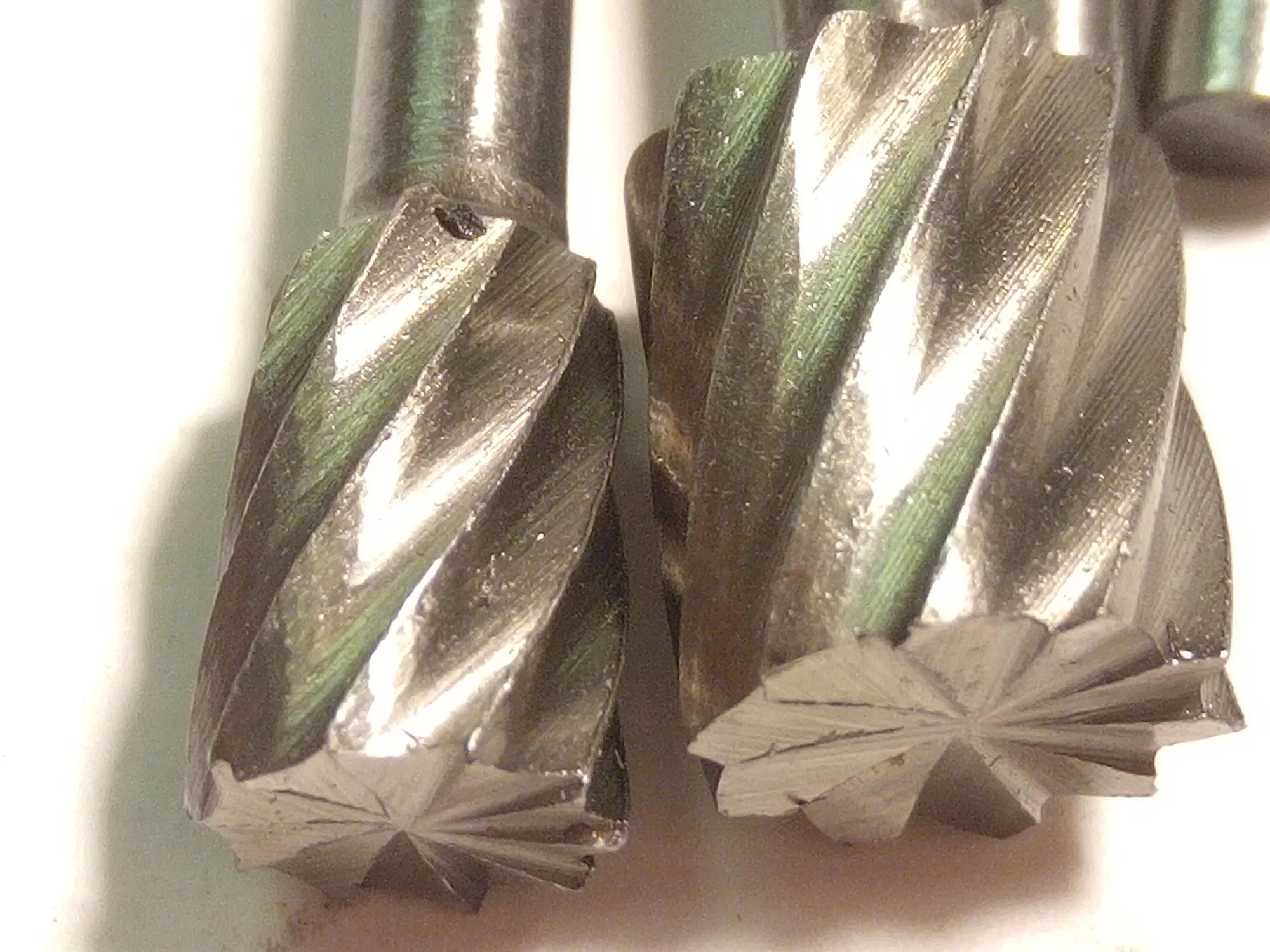 Фрезы изготовлены из стали. Это подтверждается металлическим блеском. Карбида вольфрама там нет. Карбид вольфрама темнее стали, не блестит и припаивается к стальному хвостовику. Карбид вольфрама изготавливается методом прессования и не подвергается последующей механической обработке. А эти фрезы изготовлены методом шлифовки. Фрезы вообще не работают. Совершенно отсутствует угол заточки. Нет режущей кромки. Отвратительное механическое качество