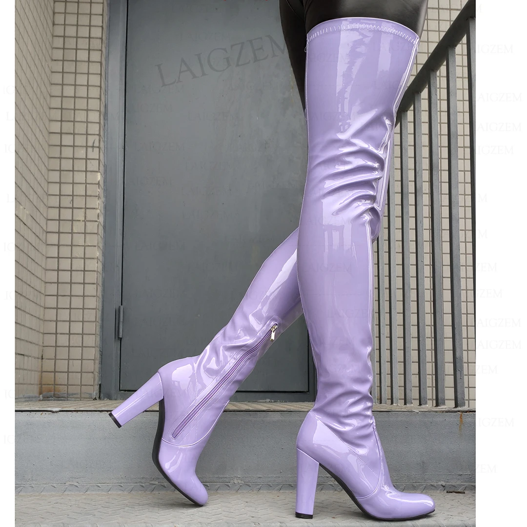 LAIGZEM/женские ботфорты с круглым носком; Блестящие сапоги до бедра на Высоком толстом каблуке с боковой молнией; Обувь ручной работы; Женская обувь; Большие размеры 41, 43, 47, 52
