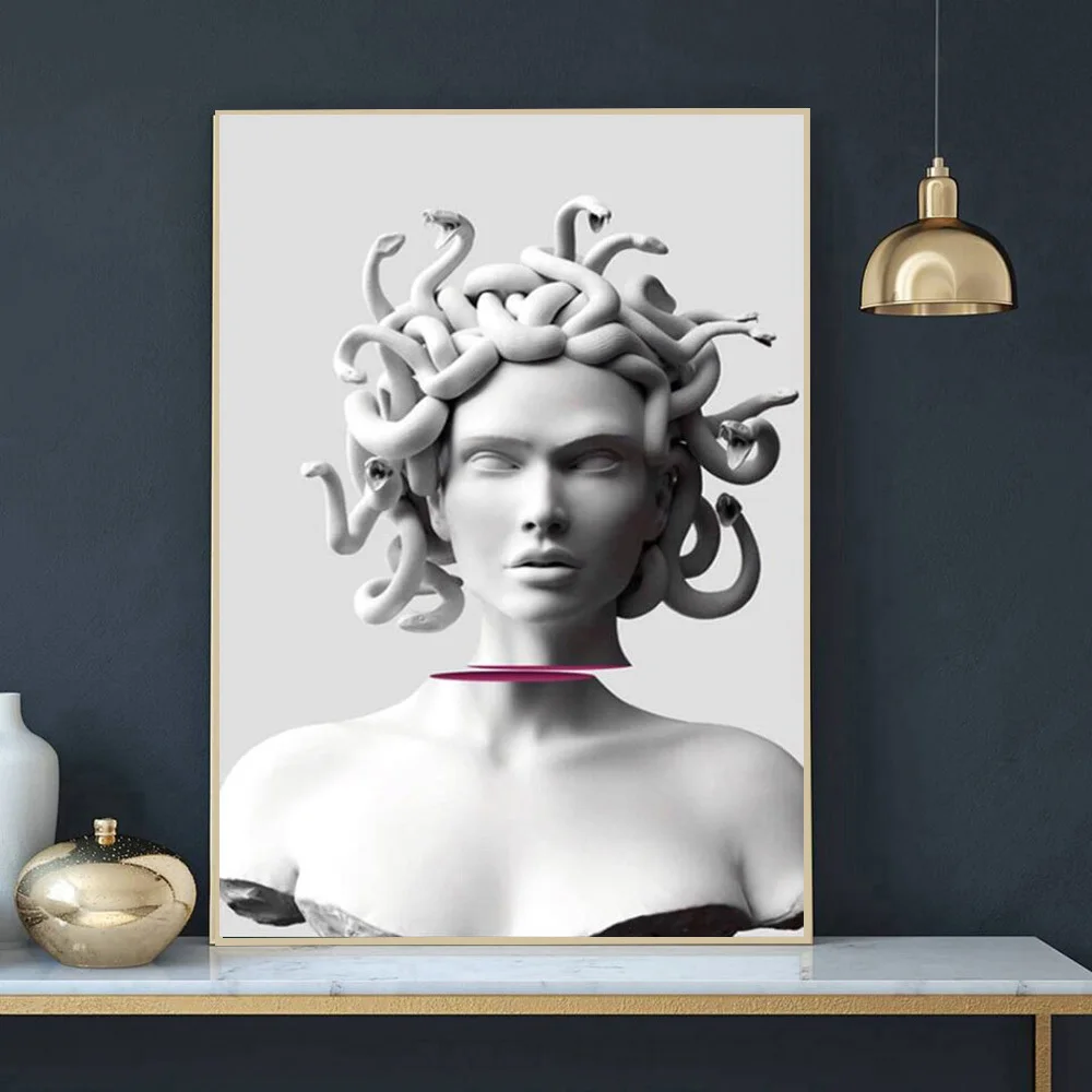 Абстрактная статуя медузы, живопись на холсте, черно-белая Медуза, змея, художественные плакаты и принты, домашняя настенная живопись