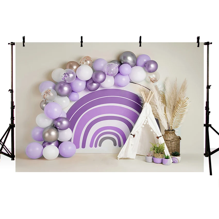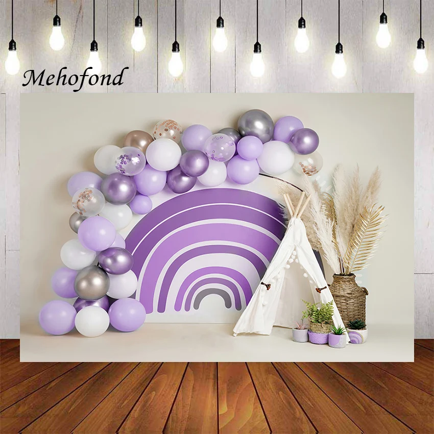 Фон для фотосъемки Mehefond в стиле бохо Радуга богемные девушки Фотофон фиолетовые воздушные шары торт