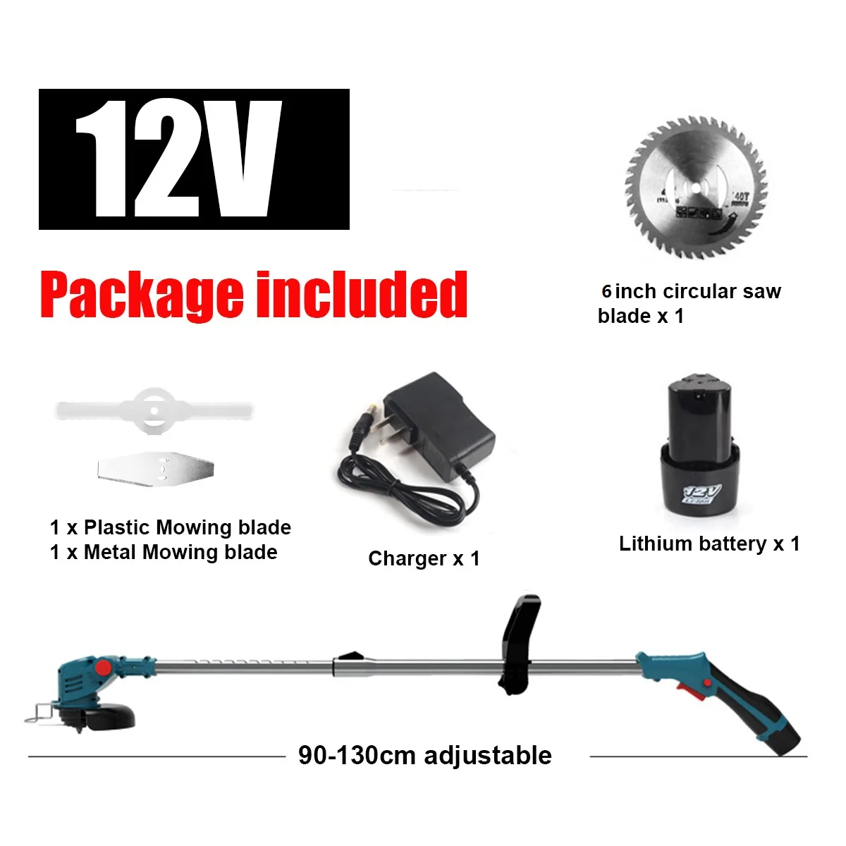 Посылка включает в себя:1 x беспроводной электрический триммер для травы1/2 x батареяЗарядное устройство-1 шт.1 x легированная пила1 x пластиковое лезвие для скашивания1 x металлическое лезвие для скашивания