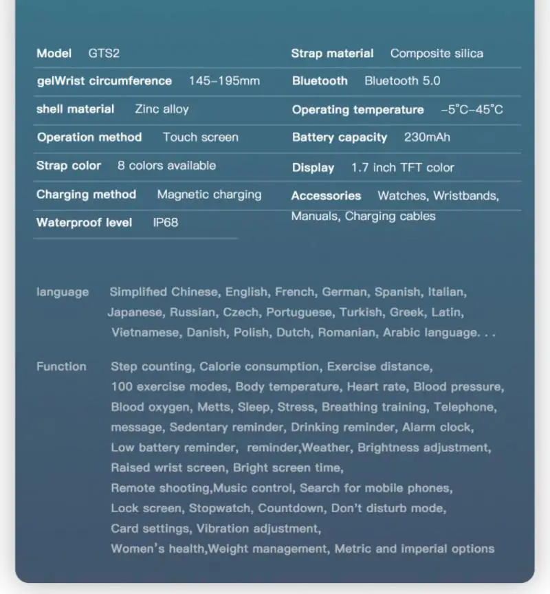 Другие функции: яркий экран, уровень яркости, погода, изменение циферблата, напоминание о сообщениях, напоминание о звонках, управление музыкой, секундомер, обратный отсчет, калькулятор, мобильный телефон, фонарик, настройка вибрации, время отдыха на экране, выбор модуля, здоровье женщин, управление весом, напоминание о сидячем положении, напоминание о питьевой воде, Будильник и так далее.
