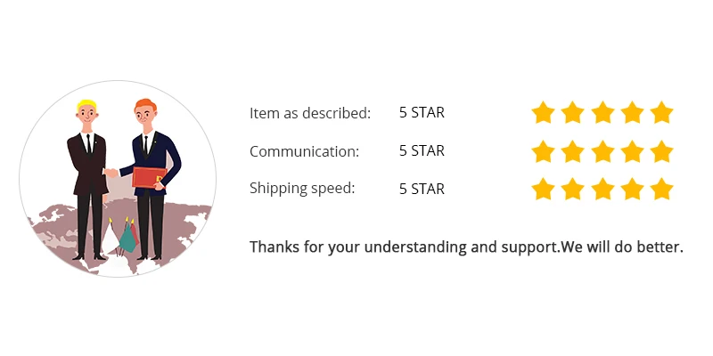 Не удовлетворены: пожалуйста, не открывайте спор, свяжитесь с нами, прежде чем оставить нейтральный (3 звезды), отрицательный (1-2 звезды) комментарий, мы постараемся сделать все возможное, чтобы решить вашу проблему.